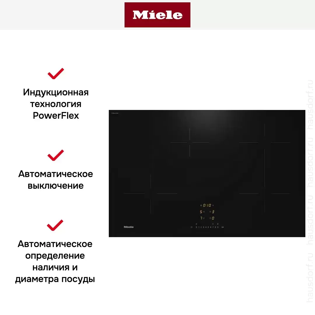 Варочная панель работает на индукционном нагреве — это значит, что повышается температура непосредственно посуды, в которой готовится блюдо. Таким образом промежуточная ступень с предварительным нагревом конфорки пропускается — сокращается время, повышается безопасность. Количество конфорок в этой модели: 4.