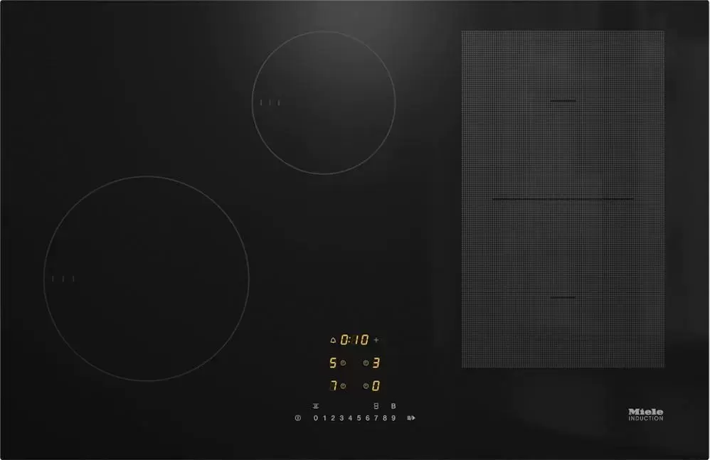 Miele KM 7474 FL — индукционная независимая варочная панель из линейки SmartLine для установки на столешницу или монтажа заподлицо с ней. Материал изготовления этой модели шириной 80 см и глубиной 52 см — черная стеклокерамика без рамки. В правой части находятся две зоны нагрева мощностью по 3,65 кВт, которые могут объединяться в одну большую зону PowerFlex для приготовления в посуде овальной формы. Слева и в центре находятся две круглые зоны нагрева с возможностью расширения до 22 см и 23 см. Все конфорки оснащены функцией распознавания местонахождения и диаметра посуды: при установке кастрюли или сковороды автоматически включается индикатор соответствующей конфорки. Электронная сенсорная панель управления и цифровой дисплей находятся на фронтальной части прибора.