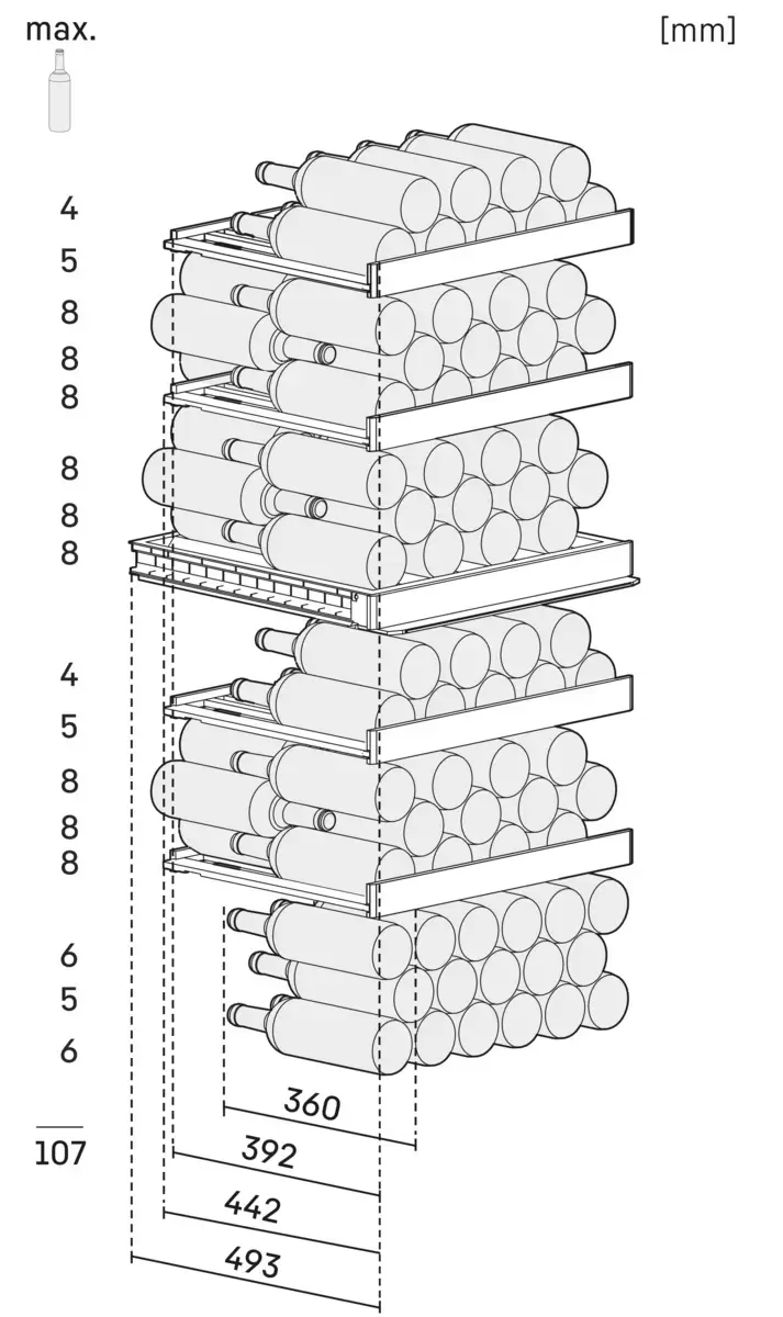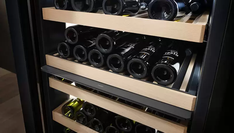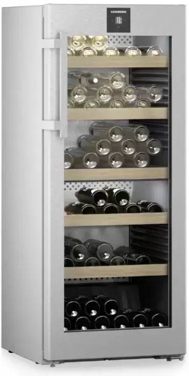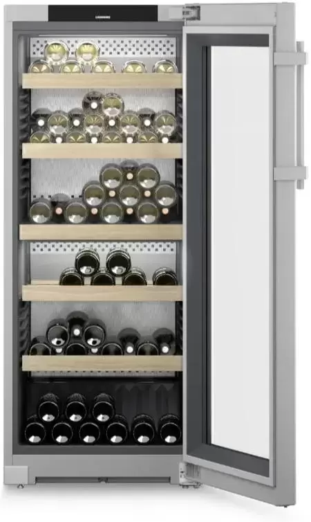 Винный холодильник Liebherr WPsd 4652 имеет две температурные зоны, в которых одновременно можно хранить разные сорта алкоголя и выставлять разные сочетания настроек. Он устанавливается отдельно, что удобно, если у вас есть специальное помещение — кладовая, погреб и т.д. Количество бутылок, которое можно разместить с учетом полной комплектации и из расчета объема бутылки 0,75 л, — 107 шт.