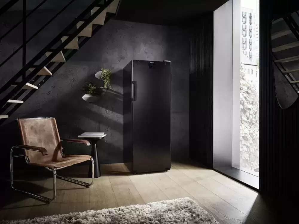 Глухая дверь без стекла надежно защищает вино от влияния ультрафиолетовых лучей, которые проникают, если шкаф находится в солнечной комнате. Это гарантирует также герметичное хранение. Цвет корпуса — антрацит. Дверь можно перевесить на другую сторону, поэтому вариантов размещения его в доме становится больше.