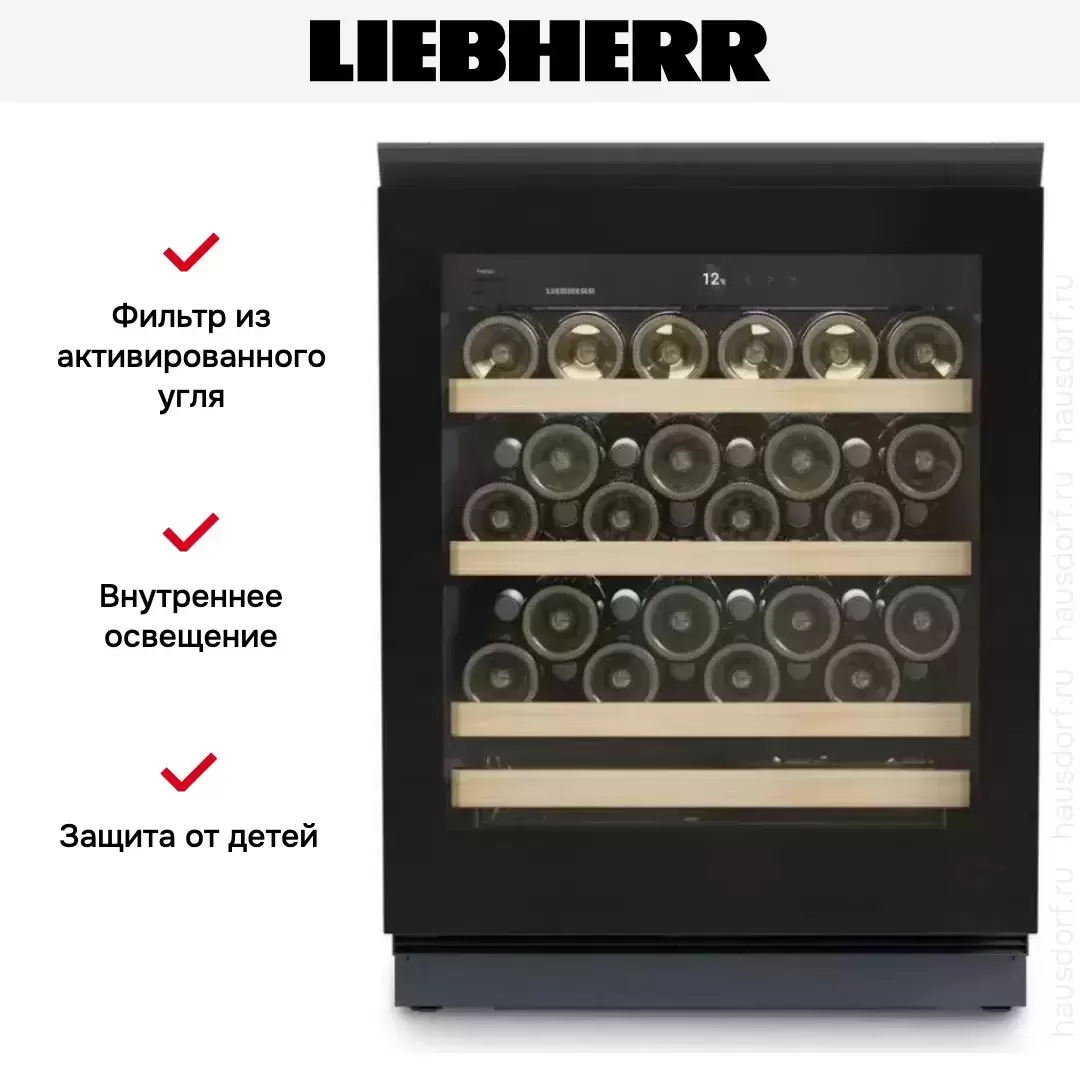 Винный холодильник Liebherr UWgb 3631 имеет одну температурную зону, в которой можно разместить бутылки и единовременно выставить только одну комбинацию настроек. Он встраивается в нишу, что удобно, если у вас ограничен метраж помещения. Благодаря компактным размерам данная модель — отличный выбор для офиса, гостиничного номера. Количество бутылок, которое можно разместить с учетом полной комплектации и из расчета объема бутылки 0,75 л, — 44 шт.