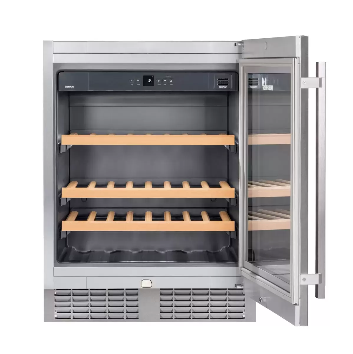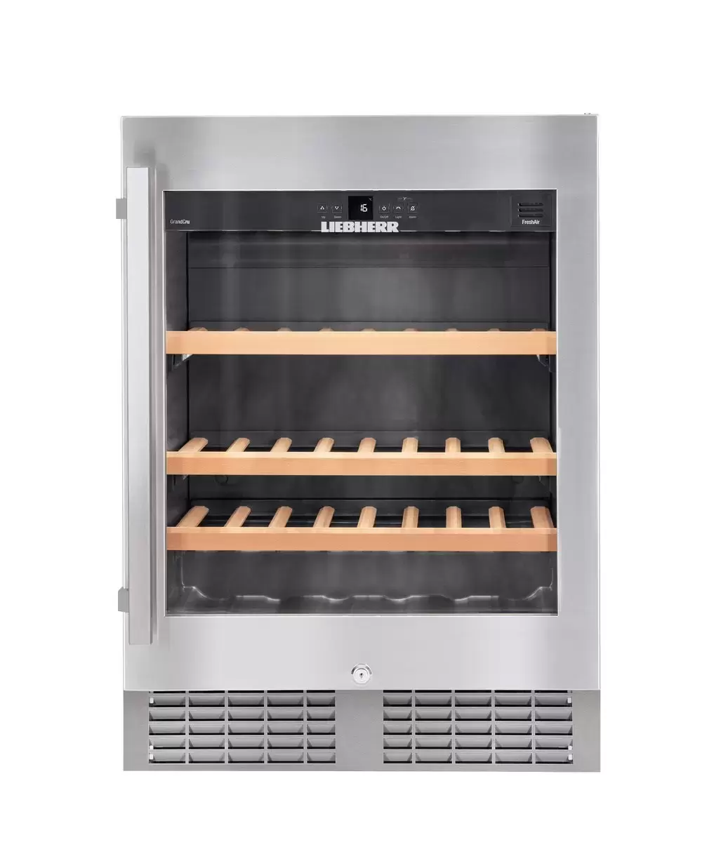 Винный шкаф Liebherr UWKes 1752 — модель австрийского производства высотой 81 см и вместимостью 46 бутылок для размещения под столешницей. Фасад изготовлен из нержавеющей стали и дополнен удобной вертикальной ручкой. Сенсорное управление с ЖК-дисплеем MagicEye позволяет настраивать температуру в диапазоне + 5°С до +20°С и выбирать прочие параметры работы. Панель управления можно заблокировать от детей. Стальная дверца с изолирующим стеклопакетом защищает вино от проникновения ультрафиолета. Корпус целиком изготовлен из стали и отличается особой прочностью. Автоматическая система размораживания упрощает уход за прибором. Три полки, изготовленные из натурального дерева, можно легко выдвинуть на телескопических направляющих. О превышении заданной температуры в камере и других неисправностях оповещает световая и звуковая сигнализация. Сменный фильтр из активированного угля защищает от посторонних запахов, которые могут возникнуть при длительном хранении. Модель относится к климатическому классу SN-ST и может эксплуатироваться в широком диапазоне температур от + 10 до +38 °С. Сохранности коллекции вин способствует малый уровень шума 40 дБ.