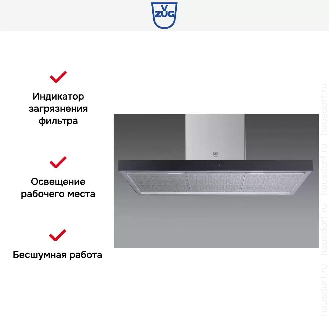 Данная вытяжка крепится к потолку — обычно над кухонным островом, где расположена рабочая зона. Обратите внимание на цветовые сочетания модели V-ZUG AI6T12LQTLG, чтобы органично вписать ее в свою квартиру. Оттенок корпуса: нержавеющая сталь/черное стекло. Благодаря лампочкам, которые расположены на нем, можно освещать плиту и столешницу рядом, чтобы готовить было еще проще и приятнее.