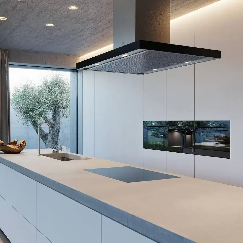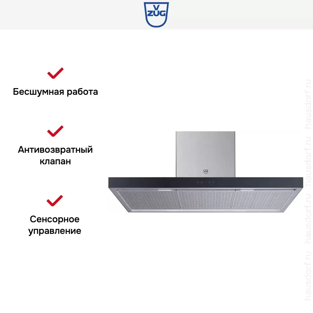 Данная вытяжка крепится к потолку — обычно над кухонным островом, где расположена рабочая зона. Обратите внимание на цветовые сочетания модели V-ZUG AI6T12QTLG, чтобы органично вписать ее в свою квартиру. Оттенок корпуса: нержавеющая сталь/черное стекло. Благодаря лампочкам, которые расположены на нем, можно освещать плиту и столешницу рядом, чтобы готовить было еще проще и приятнее.