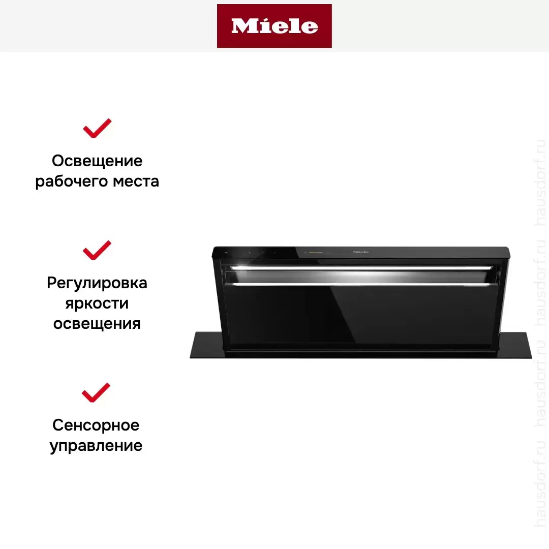Встраиваемая вытяжка — выбор тех, кто хочет максимально задекорировать технику, или владельцев маленькой кухни. Тип встраивания: в стол. Обратите внимание на цветовые сочетания модели Miele DAD 4941 Levantar, чтобы органично вписать ее в свою квартиру. Оттенок корпуса: черный обсидиан. Благодаря лампочкам, которые расположены на нем, можно освещать плиту и столешницу рядом, чтобы готовить было еще проще и приятнее. Фишка этой техники — выдвижная панель.
