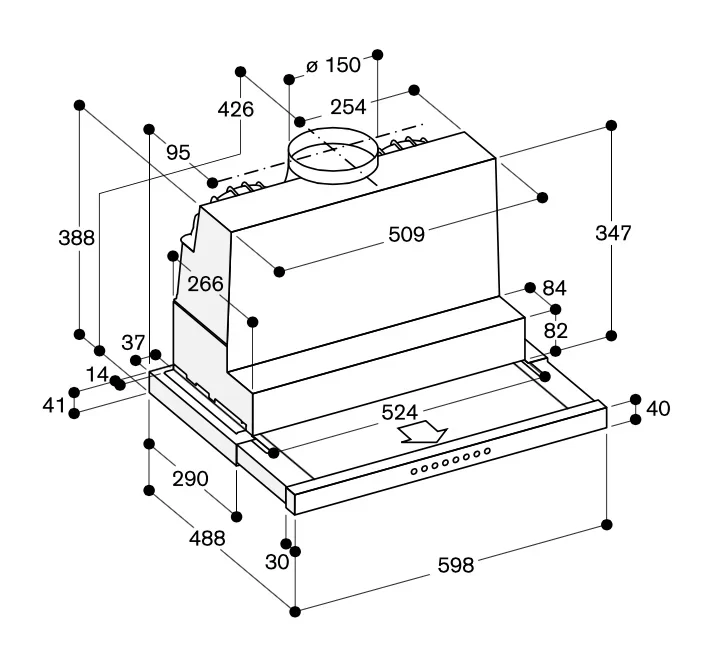 Вытяжка работает в режимах отвода и циркуляции, поэтому загрязнения удаляются из комнаты и перенаправляются в воздуховод, при этом можно очистить воздух и использовать повторно за счет возвращения его в помещение. Количество скоростей в этой модели: 4 шт. При этом максимальная производительность составляет 380 куб.м./ч. Уровень шума при полной загруженности — 69 дБ.