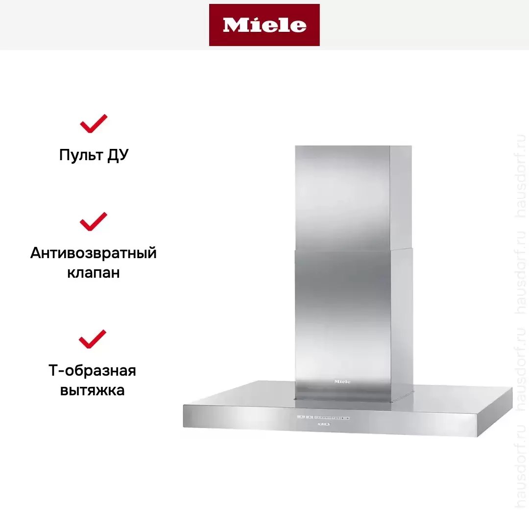 Т-образная модель Miele DA 420V-6 целиком изготовлена из нержавеющей стали с покрытием CleanCover для легкой очистки. Предусмотрены 3 скорости всасывания и интенсивный режим, который отключается автоматически. Специальные индикаторы оповещают о необходимости замены или очистки фильтров.