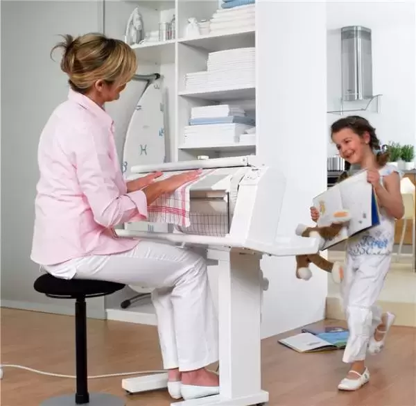 Полупрофессиональная модель с автоматической системой защиты пальцев создает все условия для эффективного глажения больших объемов белья — постельного, столового, детских вещей, спортивной и повседневной одежды. Гладильный вал шириной 83 см со свободным краем рассчитан на работу с изделиями большого размера. Запуск производится при помощи ножной педали, которую можно переместить по выбору пользователя. Это не только освобождает обе руки, но и позволяет сидеть при выполнении работы. Лучшее разглаживание складок и заломов достигается за счет планки, которая под давлением прижимает белье к валу, и специального стола для разглаженных вещей. Установка температуры глажения производится при помощи поворотного регулятора, рационально расположенного с правой стороны. Три нагревательных элемента позволяют равномерно нагревать поверхность вала. Функция пара применяется при разглаживании тонких тканей. В двух резервуарах помещается достаточное количество воды, которой хватает примерно на 40 минут глажения. О необходимости наполнить резервуары сообщит светодиодный сигнал. В сложенном виде устройство занимает не более 0,2 м2 и может поместиться в шкафу.
