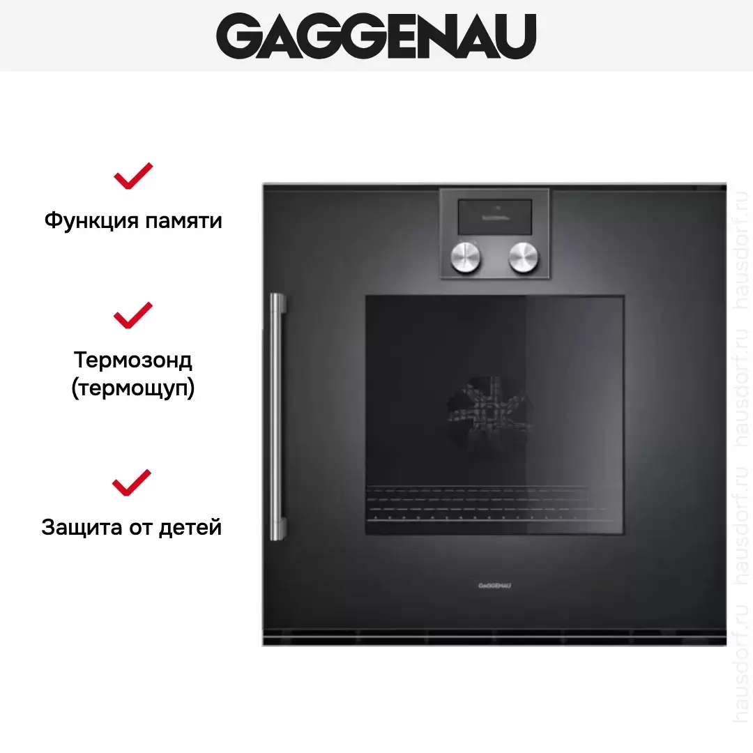 Количество режимов работы в духовом шкафу Гаггенау: 13. В число доступных программ входят: классический нагрев, верхний нагрев, нижний нагрев, конвекция, брожение, гриль для создания хрустящей корочки, пицца, и другие. Помимо основных программ воспользуйтесь специальными возможностями этого прибора: размораживанием продуктов, чтобы сократить время на подготовку; опцией автоматического поднятия теста; быстрым разогревом для ускорения работы; поддержанием температуры в камере на определенном уровне, чтобы блюда не остывали; и другими. Тип гриля в этой модели — электрический.