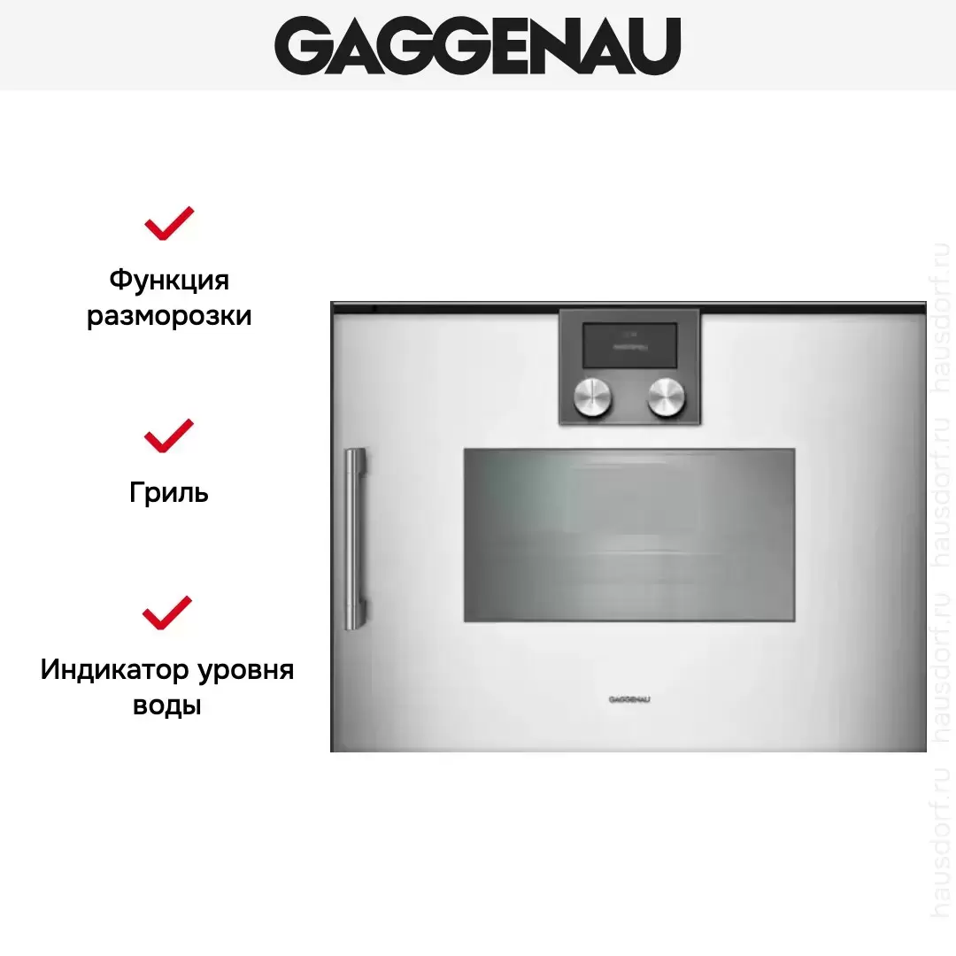 Духовой шкаф — пароварка Gaggenau BSP 250-131 выполнен в серебристом цвете. Дверь модели полностью стеклянная и не обладает возможность перевешивания. Дверной упор находится с правой стороны. Сенсорный TFT — дисплей расположен в верхней части прибора. Управление осуществляется с помощью поворотных переключателей. В комплекте находятся 2 съемных контейнера для чистой и использованной воды. Функция памяти запоминает все выбранные вами индивидуальные рецепты (включая те, которые были использованы с термощупом). Во время работы корпус устройства остается холодным. Среди дополнительных преимуществ: