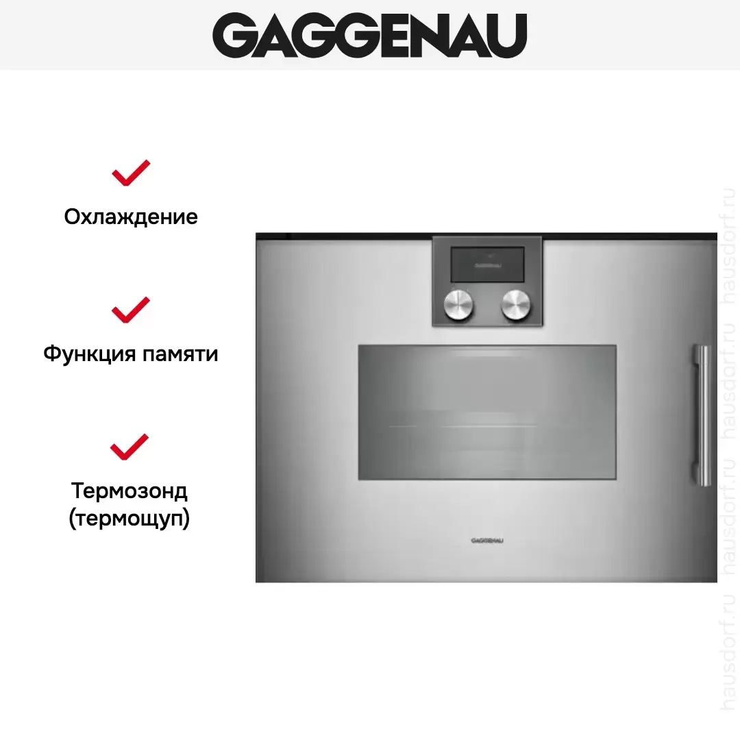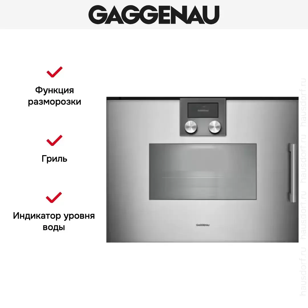 Духовой шкаф — пароварка Gaggenau BSP 251-111 выполнен в цвете металлик. Гриль расположен под стеклокерамической панелью. Программы очистки от накипи и сушки полностью автоматические. Сенсорный TFT — дисплей расположен в верхней части прибора. Управление осуществляется с помощью поворотных переключателей. Корпус прибора остается холодным во время работы, поэтому риск получения ожога сводиться к нулю. Система безопасности «защита от детей» полностью блокирует всю панель управления. Среди дополнительных преимуществ: