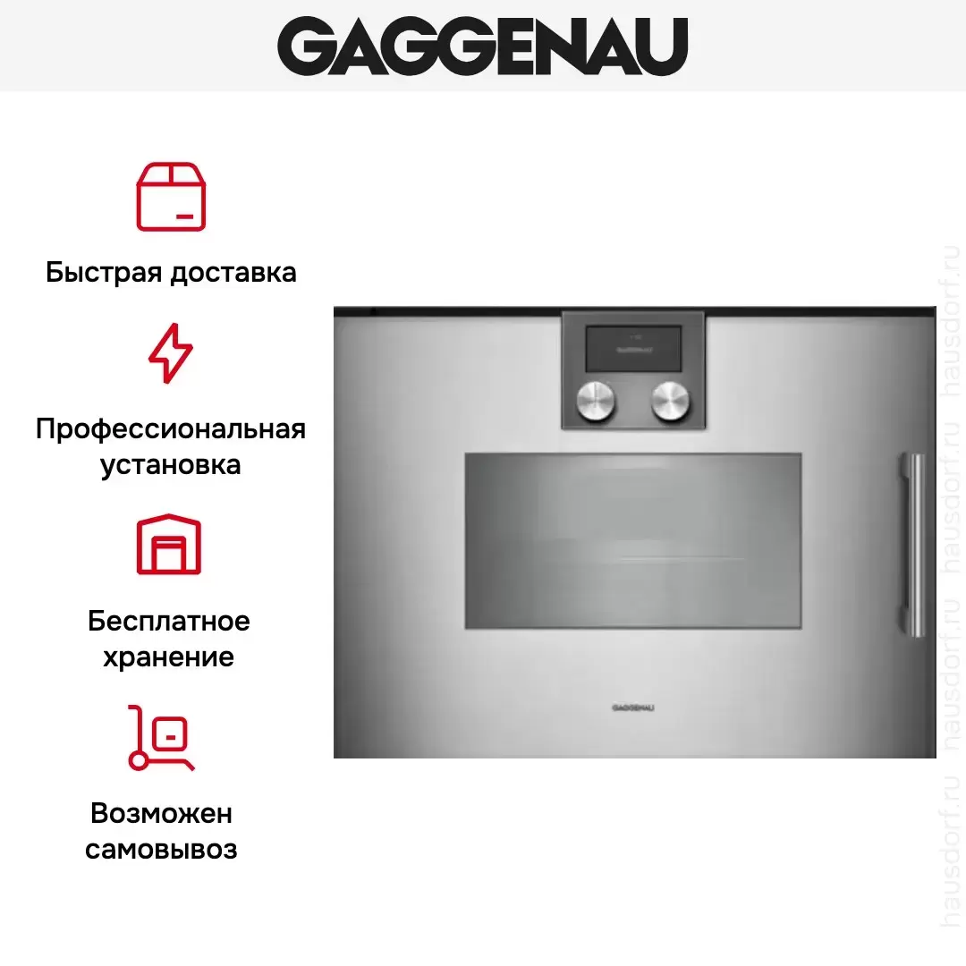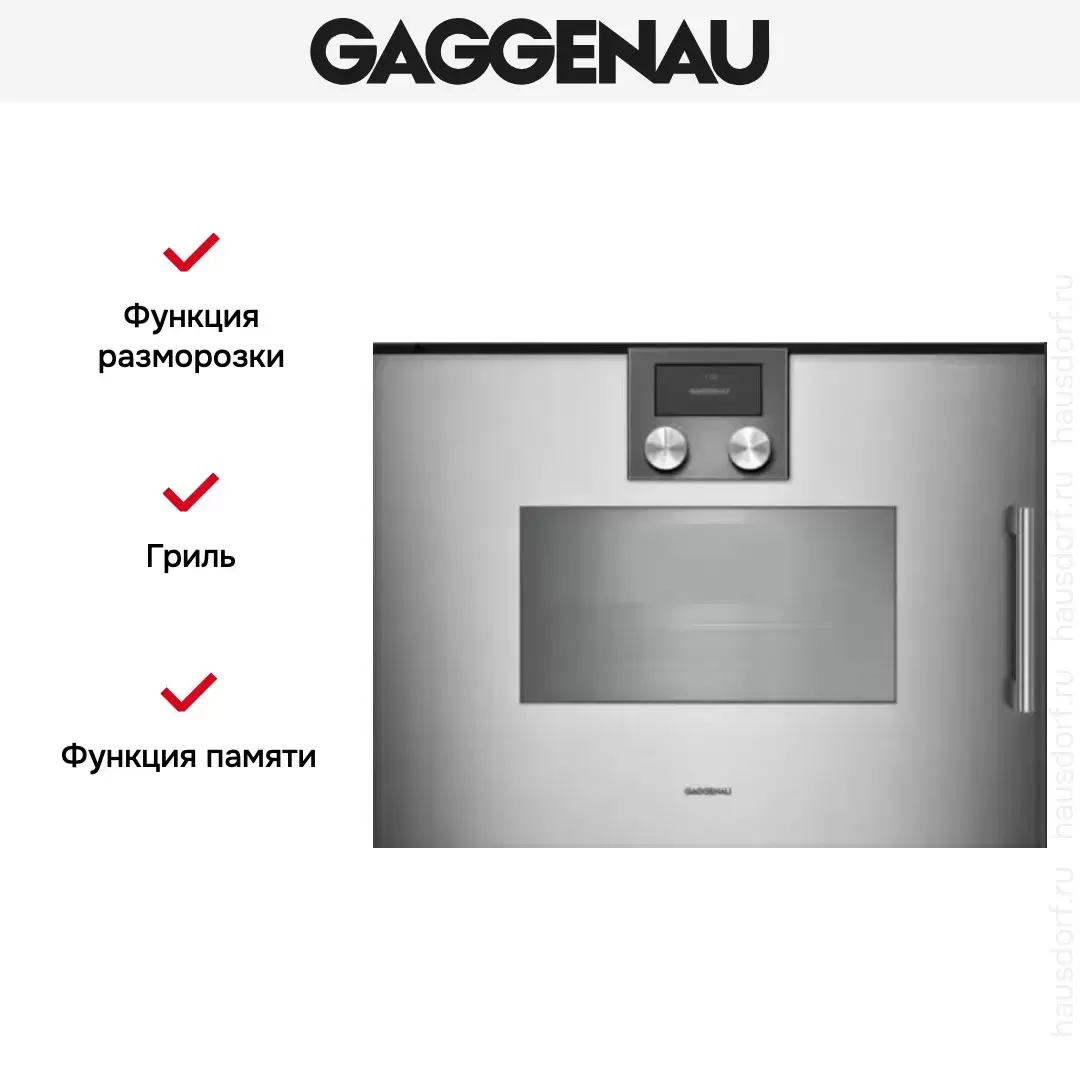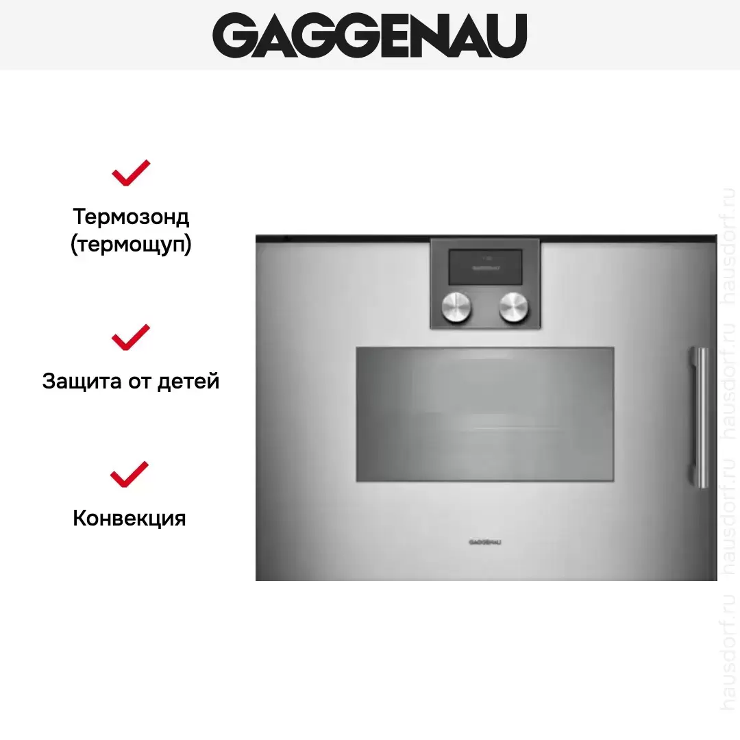 Духовой шкаф — пароварка Gaggenau BSP 261-111 имеет сенсорный TFT — дисплей и поворотные переключатели. Панель управления интегрирована в дверцу и находиться сверху. Таймер обладает функциями приготовления, выключения, краткосрочной и долгосрочной. Точка кипения определяется автоматически. Функция памяти сохраняет выбранные вами режимы (включая рецепты с использованием термощупа). Трехточеченый температурный щуп отключается автоматически и отображает время. Система безопасности «защита от детей» уберегает от нежелательного сбоя настроек. Среди дополнительных преимуществ: