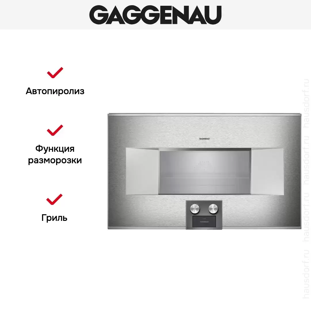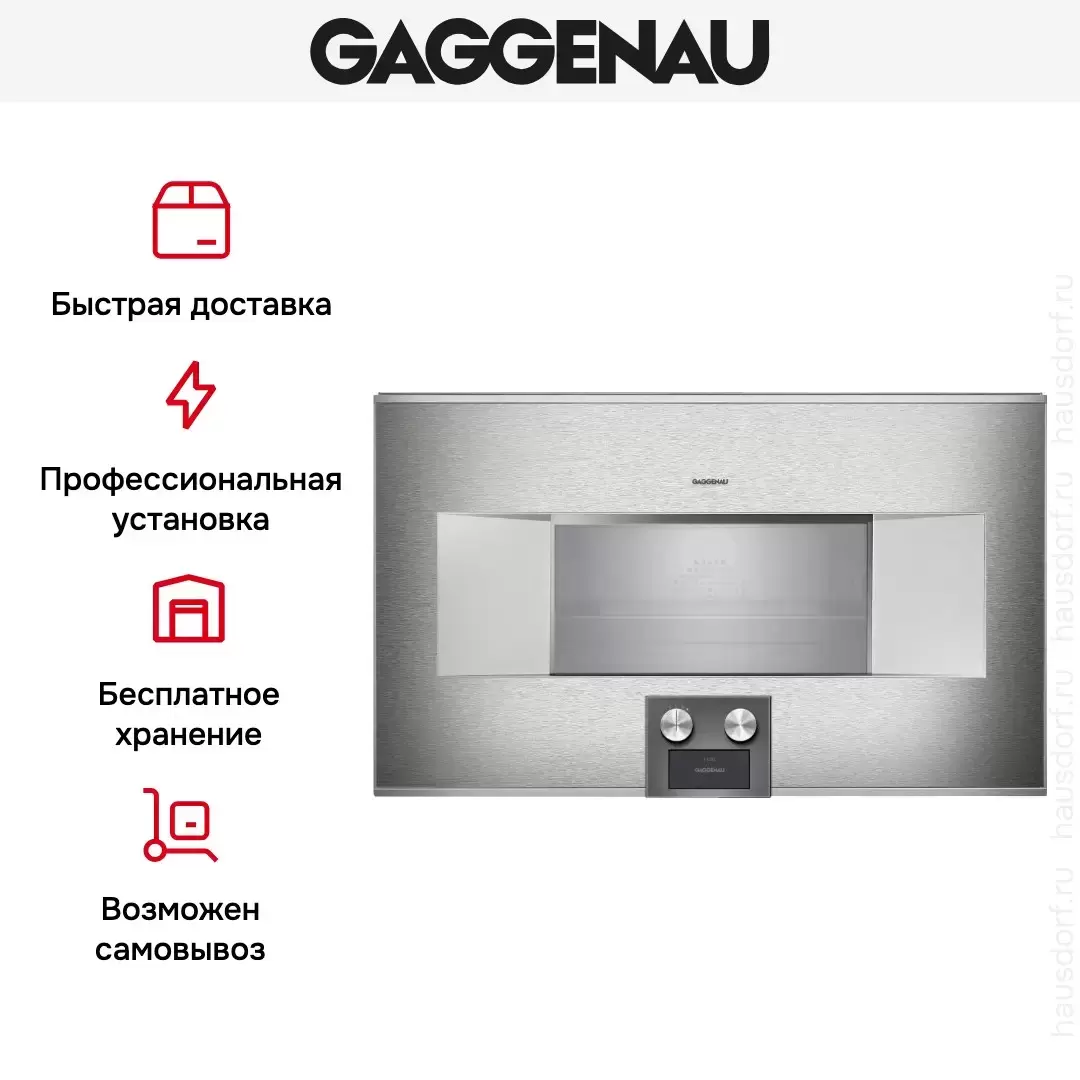 Gaggenau BS485112 — комбинированный духовой шкаф-пароконвектомат с большой рабочей камерой из нержавеющей стали, которая освещается двумя LED-лампами. Управление происходит с помощью поворотных переключателей и сенсорного TFT-дисплея. За безопасность эксплуатации отвечают функции блокировки от детей и защиты на время отпуска.