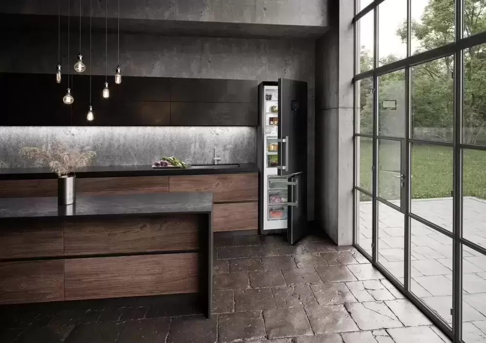 Полноразмерный агрегат высотой 201 см и шириной 70 см в корпусе цвета Black Steel с обработкой от отпечатков пальцев SmartSteel рассчитан на загрузку большого количества продуктов. Снаружи на дверце находится 7-дюймовый сенсорный цветной TFT-дисплей для регулировки температуры и сенсорные кнопки для задания дополнительных опций. Управлять работой устройства можно также дистанционно: для этого требуется установить дополнительный модуль SmartDeviceBox. Прибор оснащен двумя контурами охлаждения DuoCooling для независимой регулировки температуры в камерах и раздельного воздухообмена. Автоматическое размораживание в холодильном отделении и система NoFrost предотвращают оседание инея на внутренней поверхности камеры. В холодильном отделении продукты размещаются на полках из закаленного стекла, в ящиках для овощей и фруктов и на полках Premium GlassLine на дверце. В зоне свежести предусмотрены отделение Dry Safe с низкой влажностью и отделение HydroSafe с повышенной влажностью для свежей зелени и овощей. Морозильная камера с контейнерами FrostSafe с прозрачной передней частью может работать автономно при отключении электроэнергии до 24 часов.