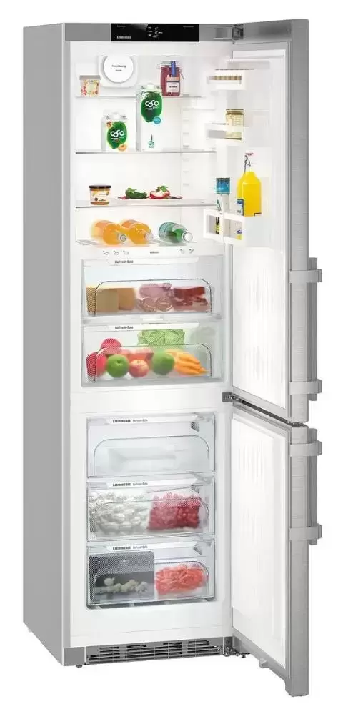 Liebherr CBNef 4835 — отдельностоящий двухкамерный холодильник. Модель немецкой сборки достигает в высоту 201 см, но благодаря стандартной ширине 60 см может быть установлена в кухне небольшой площади. Новая компоновка BluPerformance позволила увеличить объем до 391 литра за счет отсутствия на задней стенке конденсатора и резервуара для сбора талой воды. Серебристый фронт изготовлен из нержавеющей стали с покрытием SmartSteel, предохраняющим от загрязнений и мелких повреждений. Алюминиевая ручка оснащена встроенным механизмом открывания. Дверцу благодаря особенностям конструкции можно перенавесить справа налево. В верхней части за дверцей расположена панель управления, содержащая сенсорные кнопки и 2,4-дюймовый сенсорный монохромный TFT-дисплей. При необходимости устройством можно управлять с мобильного телефона или планшета: предварительно необходимо установить специальный модуль SmartDeviceBox. Система NoFrost позволяет замораживать продукты с помощью потока холодного воздуха, который создается вентилятором. При этом на внутренней поверхности камеры не появляется наледь, а размораживание значительно упрощается. Класс энергопотребления А++ гарантирует экономичную работу устройства.