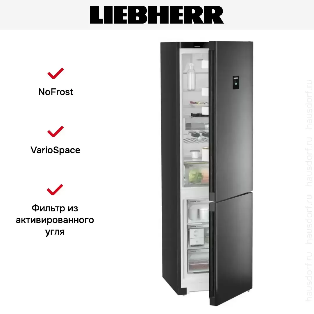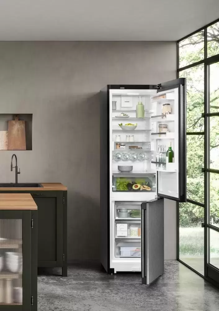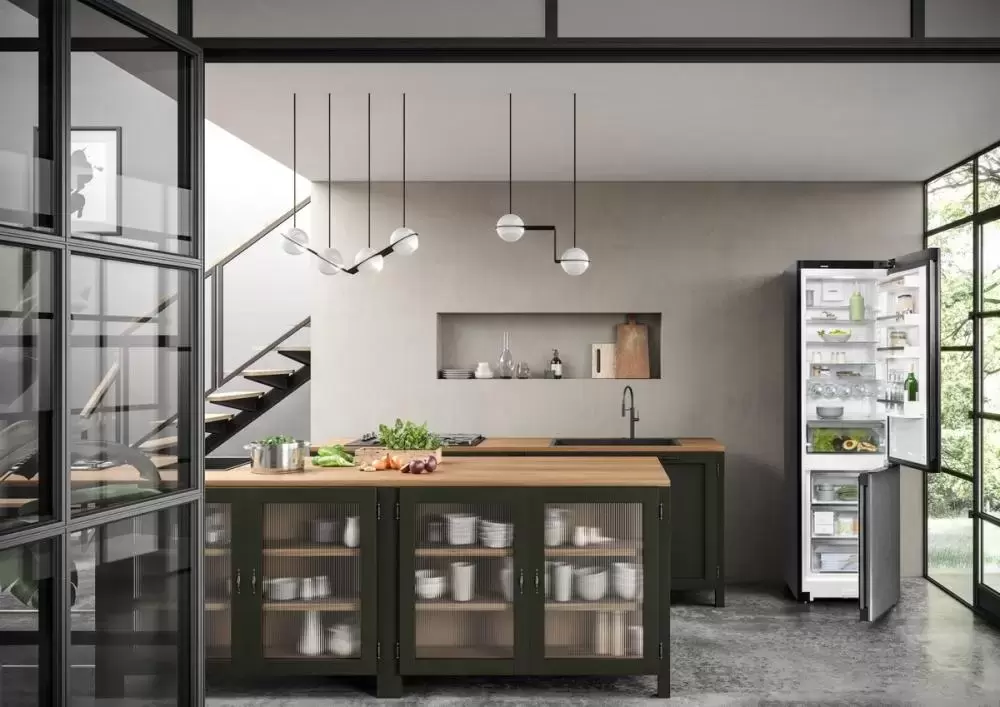Отдельностоящий холодильник черного цвета — интересное решение для современной кухни. Благодаря конструкции InteriorFit его можно установить вплотную к стене (сзади есть панель, которая перекрывает трубки испарителя) или встроить в нишу между шкафами. Таким образом на виду останутся только двери — этот способ сэкономит место в небольшой кухне.