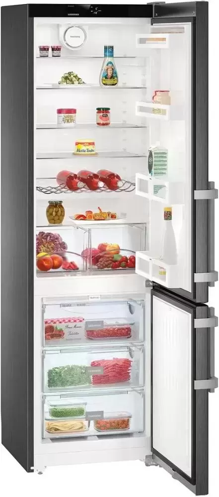 Двухкамерный отдельно стоящий холодильник Liebherr CNbs 4015 Comfort NoFrost — вместительная модель высотой 201 см и общим объемом 390 литров. Его отличает стильный корпус из стали цвета «черный металл» с обработкой против отпечатков пальцев. Морозильная камера оснащена системой размораживания No Frost. Электронная панель управления с большим сенсорным TFT-дисплеем расположена за дверцей. Устройство относится к высокому классу энергоэффективности A++.