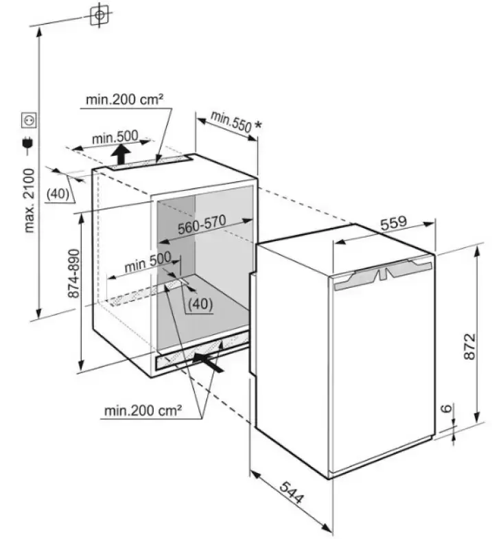 Модель высотой 87 см в стальном корпусе с дверным упором справа встраивается в нишу или шкаф. Отличается жестким креплением мебельного фасада door on door, так что дверца может открываться ни большой угол до 115°. Класс энергоэффективности A++ означает, что устройство потребляет минимальное количество электроэнергии. Климатический класс SN-T гарантирует, что холодильник способен работать при наружных температурах от +10 до +43°C. Для регулировки параметров работы используется система MagicEye с ЖК-дисплеем, кнопками и цифровой индикацией температуры. В холодильном отделении расположены 4 полки из закаленного стекла, способного выдержать значительный вес, в том числе 3 регулируемые по высоте и одна складная полка. Полки на дверце выполнены в дизайне Comfort GlassLine. Автоматическое оттаивание облегчает очистку стенок, поскольку на них не намерзает лед. Автоматический режим SuperCool способствует быстрому снижению температуры, что особенно удобно при загрузке большого количества свежих продуктов. Уровень шума очень низок, он составляет всего 33 дБ. Для удобного встраивания применяются регулируемые по высоте ножки и мебельная вентиляция.