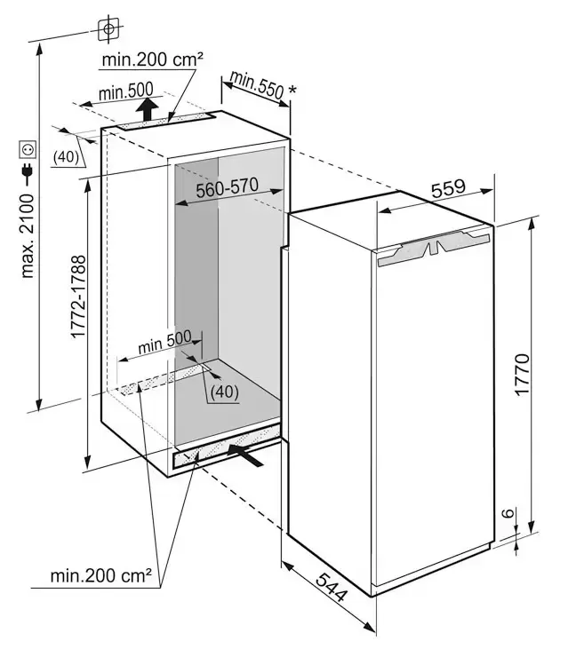 Модель германского производства с одной дверцей имеет высоту 177 см и общий объем 324 литра. Она встраивается в шкаф или нишу и предусматривает жесткое крепление декоративного мебельного фасада по системе door on door. Дверцу можно открывать на угол 115°, что позволит загружать продукты и посуду большого размера. Цифровой ЖК-дисплей MagicEye обеспечивает регулировку температуры с высокой точностью.