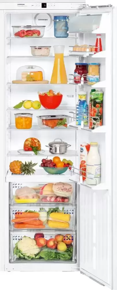 Встраиваемый холодильник класса PremiumPlus. Холодильная камера отличается большой вместительностью, укомплектована семью стеклянными полками, системой оптимального распределения воздуха и функцией автоматической разморозки. Дверцы холодильника оснащены технологией амортизации закрывания. Управление настройками – электронное.
