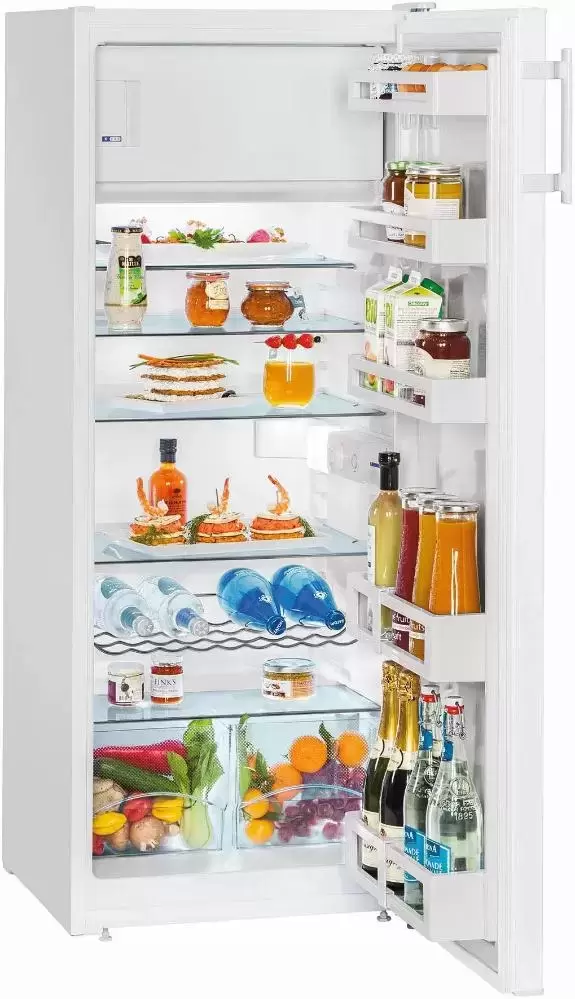 Liebherr K 2814 — отдельно стоящий однокамерный холодильник класса Comfort. Прибор высотой 140 см и полезным объемом 250 л оснащен верхней морозильной камерой полезным объемом 21 л. Класс энергетической эффективности A++ гарантирует низкое потребление электроэнергии — в среднем оно составляет 161 кВтч/год. Модель с глянцевым белым фасадом имеет одну дверцу, которую можно при желании перенавесить справа налево. Ручка для удобства снабжена встроенным толкателем. Система CoolPlus позволяет предохранить устройство от размораживания при температуре окружающей среды менее 18°C. Холодильное отделение с автоматической системой оттаивания оснащено пятью полками из закаленного стекла, при этом четыре из них регулируются по высоте. Полки на дверце выполнены в фирменном дизайне GlassLine. В морозильном отделении мощность замораживания достигает до 2 кг продуктов в сутки, а время сохранения холода при отключении электроэнергии составляет 15 часов. Механическая система управления с поворотным переключателем позволяет выставить один из 7 уровней охлаждения.