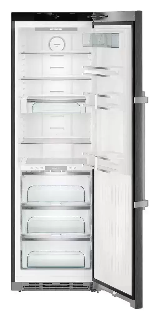 Модель высотой 185 см можно устанавливать в готовую нишу или придвигать вплотную к стене. Корпус оригинального цвета Black Steel выполнен из нержавеющей стали с обработкой от отпечатков пальцев. Дверной доводчик SoftSystem обеспечивает мягкое закрытие дверцы, даже если холодильник полон. Внутреннее наполнение включает 5 регулируемых по высоте полок и одну фиксированную из закаленного стекла, отделения для бутылок и консервов, два контейнера с плотной силиконовой крышкой VarioBox для масла и сыра на дверце. В зоне свежести находятся два отделения, которые выдвигаются на телескопических шинах: Dry Safe и HydroSafe с разным уровнем влажности. Включение режима суперохлаждения SuperСool поможет подготовить камеру к загрузке большой партии продуктов. Светодиодное освещение с эффектом плавного изменения яркости создает отличный обзор. Дополнительно можно установить модуль дистанционного управления SmartDeviceBox, чтобы задавать настройки с мобильных устройств. О неисправностях, повышении температуры и неплотно закрытой дверце предупреждает оптическая и звуковая сигнализация. Энергопотребление модели соответствует высокому классу А++.