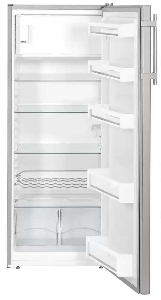 Отдельностоящий холодильник Liebherr Kel 2834 серебристого цвета с ручкой со встроенным толкателем изготовлен из стали. Полный объем модели 250 л, 21 л из которых — морозильная камера.