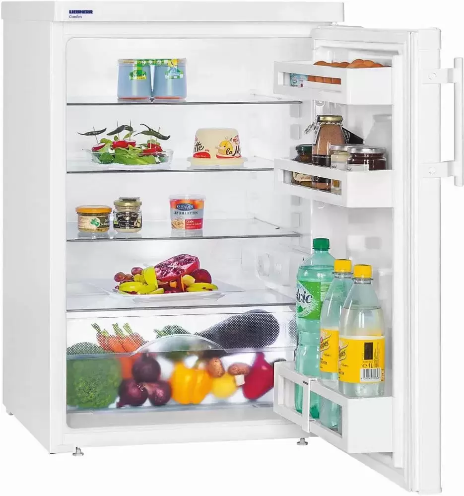 Однокамерный холодильник Liebherr T 1710 Comfort — небольшая модель высотой 85 см и общим объемом 154 литра для размещения под столешницей или вплотную к стене. Верхняя крышка съемная, она может использоваться в качестве стола. Серия SwingLine привлекает внимание стильным дизайном со скошенными углами, глянцевым белым фасадом, удобной ручкой со встроенным толкателем. Дверца с правым дверным упором имеет возможность перенавешивания на другую сторону. Ножки регулируются по высоте. Модель без морозильника оснащена автоматической системой размораживания, которая исключает появление наледи на стенках камеры. Для регулировки температуры служит поворотный переключатель, который позволяет задать уровень охлаждения от 1 до 7. Устройство оснащено термостатом, который обеспечивает поддержание стабильной температуры в камере. Продукты удобно размещаются на четырех полках из закаленного стекла, три полки можно отрегулировать по высоте. Пластиковая рамка дополнительно защищает полки от механического воздействия, ее можно легко снять для очистки.