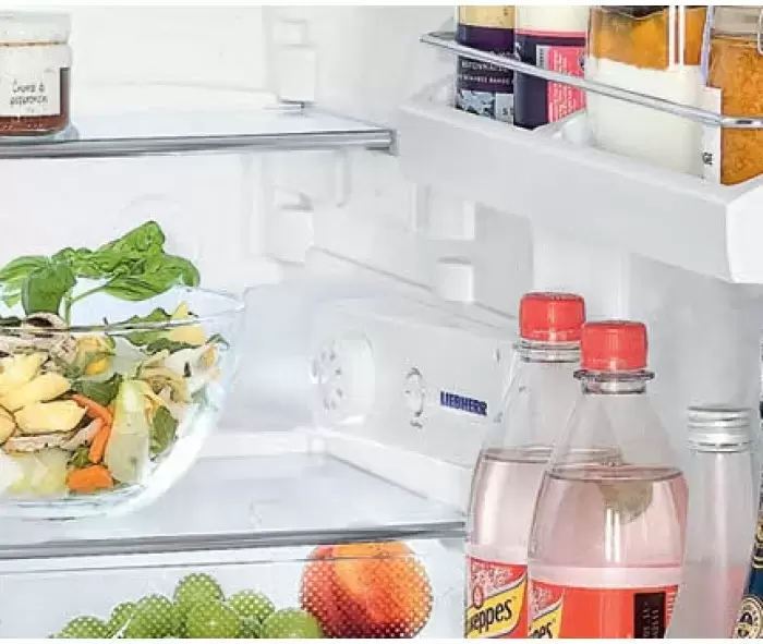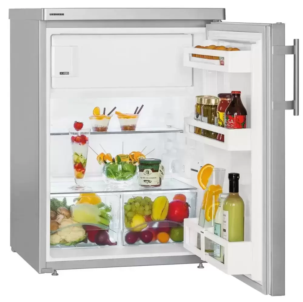 Холодильник Liebherr TPesf 1714 Comfort — компактный прибор высотой 85 см из дизайн-серии HardLine. Модель отличает серебристый стальной корпус, дверца из нержавейки и удобная ручка со встроенным толкателем. Благодаря стандартной ширине 60 см и съемной верхней панели устройство можно установить под столешницей или разместить в готовой нише. При автономном размещении верхняя панель послужит в качестве стола. Облегчить выбор места для установки прибора помогут перенавешиваемая дверца и регулируемые по высоте ножки. Общий объем холодильника составляет 152 литра. Расположенная сверху 4-звездочная морозильная камера объемом 19 литров позволяет поддерживать температуру −18°C и ниже. Она способна сохранять холод на протяжении 10 часов при отключении электроэнергии. В холодильном отделении одну из двух полок из ударопрочного стекла можно переставить по высоте. Бутылки и банки могут устанавливаться на съемных полках, расположенных на дверце. Климатический класс SN-ST позволяет использовать прибор при наружной температуре от +10°С до +38°С.