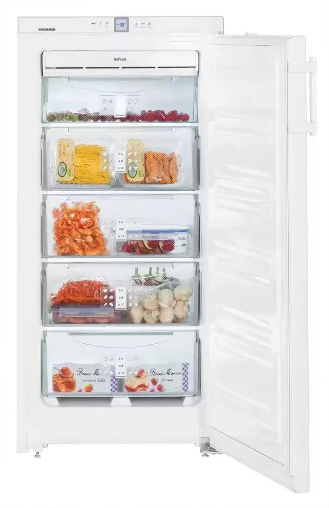 Отдельно стоящий морозильник высотой 125 см и объемом 187 литров изготовлен в дизайне Swing. Корпус целиком выполнен из нержавеющей стали, ручка оснащена встроенным толкателем. Прибор может устанавливаться вплотную к стене или в готовую нишу. Система размораживания NoFrost исключает образование льда и инея на стенках камеры, так что для очистки поверхность достаточно просто протереть. Производительность замораживания достигает 15 кг продуктов в сутки, при отключении электропитания поддерживается сохранение продуктов в замороженном виде в течение 14 часов благодаря двум аккумуляторам холода. Автоматический режим суперзамораживания SuperFrost с отключением через 65 часов быстро понижает температуру, если предстоит загрузка большого количества свежих продуктов одновременно. Продукты замораживаются с полным сохранением полезных веществ и витаминов, при этом ранее заложенные на хранение продукты не размораживаются. Прибор оснащен пятью закрытыми контейнерами с прозрачной передней частью, которая обеспечивает обзор содержимого. Система Vario позволяет извлекать контейнеры и полки, если требуется больше места для размещения продуктов.