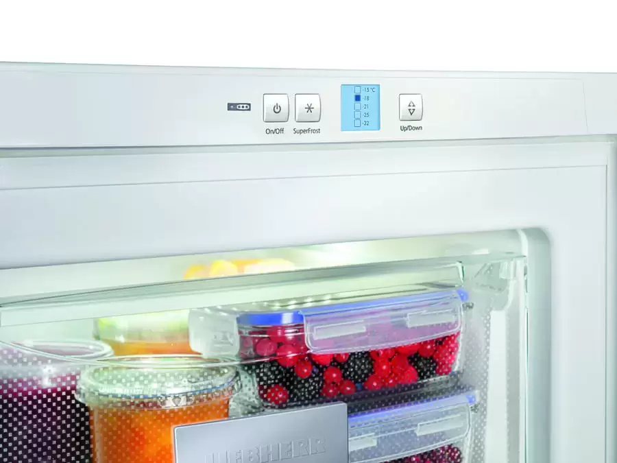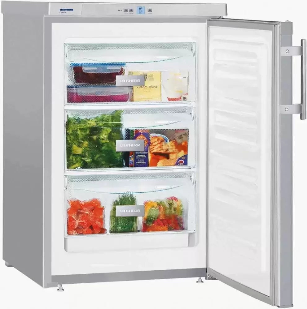 Морозильник Liebherr Gsl 1223 Comfort — отдельно стоящая модель высотой 85 см, которую можно разместить под столешницей или в тумбе кухонного гарнитура. Серебристый корпус изготовлен из стали и дополнен эргономичной ручкой со встроенным толкателем. Дверной упор находится справа, при установке прибора его можно перенавесить. Продукты размещаются в трех контейнерах, изготовленных из безопасного прозрачного пластика. Плотно закрывающиеся крышки хорошо держат холод, а высококачественный материал предотвращает примерзание продуктов к стенкам ящиков. Система VarioSpace позволяет извлекать контейнеры из камеры, чтобы разместить на освободившемся месте продукты большого размера. Технология SmartFrost препятствует образованию наледи на стенках и на замороженных продуктах. Производительность замораживания достигает 11 кг/сутки. Режим суперзамораживания SuperFrost поможет сохранить все полезные свойства замороженной продукции. Регулировка температуры осуществляется с помощью кнопок и ЖК-дисплея MagicEye в верхней части над дверцей.