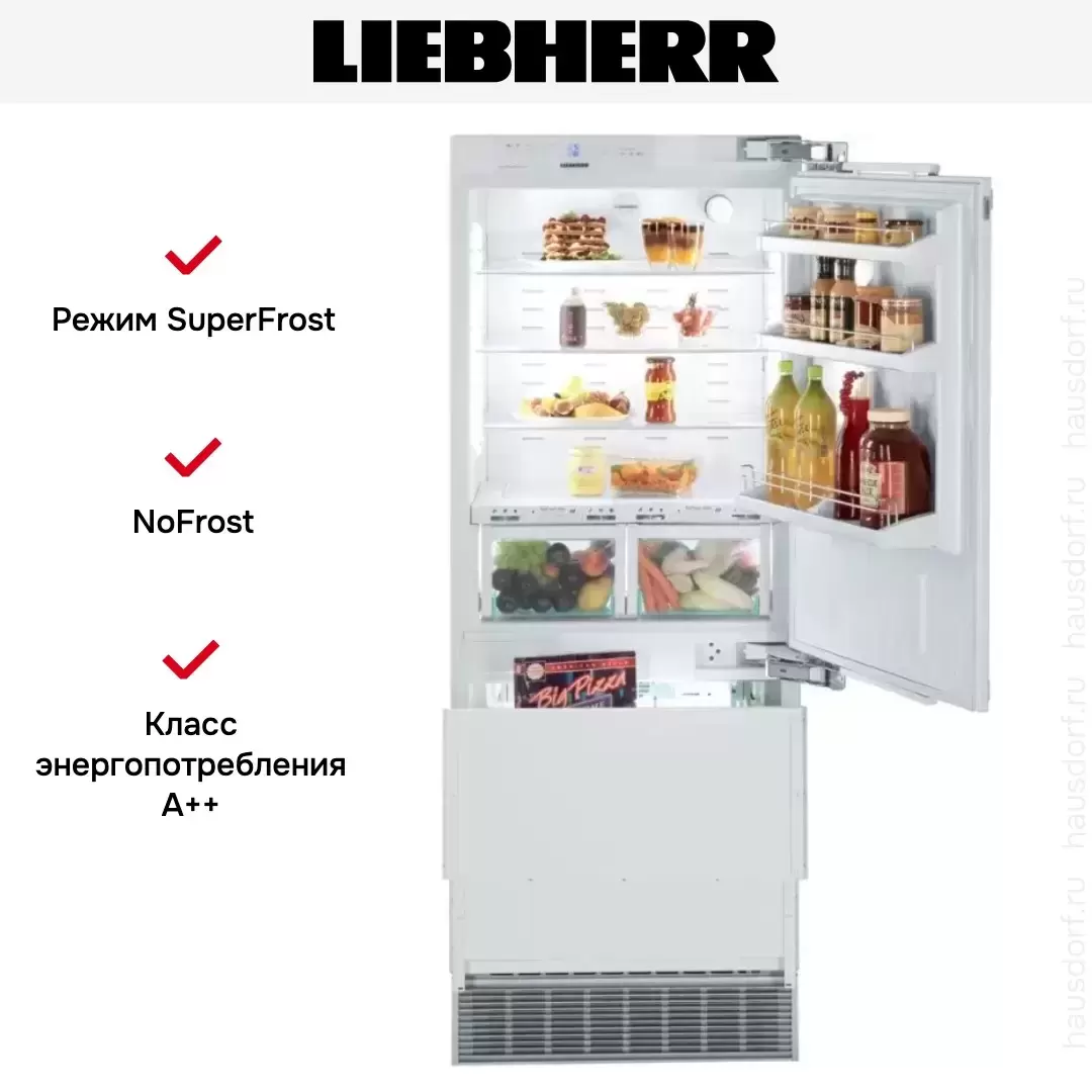Встраиваемый холодильник Liebherr ECBN 5066 Premium Plus NoFrost высотой 202 см и шириной 75 см оснащен системой PowerCooling, которая поможет равномерно распределить холодный воздух по всему объему холодильной камеры. Регулируемые ножи и мебельная вентиляция способствуют правильной установке устройства в шкаф или нишу. Система door on door предусматривает жесткое крепление мебельного фасада на дверцу холодильника: конструкция отличается прочностью, а дверца может открываться на угол до 115 градусов. Для освещения холодильной камеры используются светодиодные колонны, позволяющие плавно увеличить яркость при открытии дверцы. Полки из закаленного стекла GlassLine с рейками из нержавеющей стали можно перемещать по высоте. Автоматические функции суперохлаждения SuperСool и суперзамораживания SuperFrost подготовят отделения к размещению свежих продуктов, заранее снизив в них температуру. Для хранения мяса, рыбы, овощей и фруктов при нулевой температуре служит зона свежести BioFresh с контейнерами HydroSafe, позволяющими регулировать влажность. Для извлечения контейнеров предназначены телескопические направляющие SoftTelescopic.