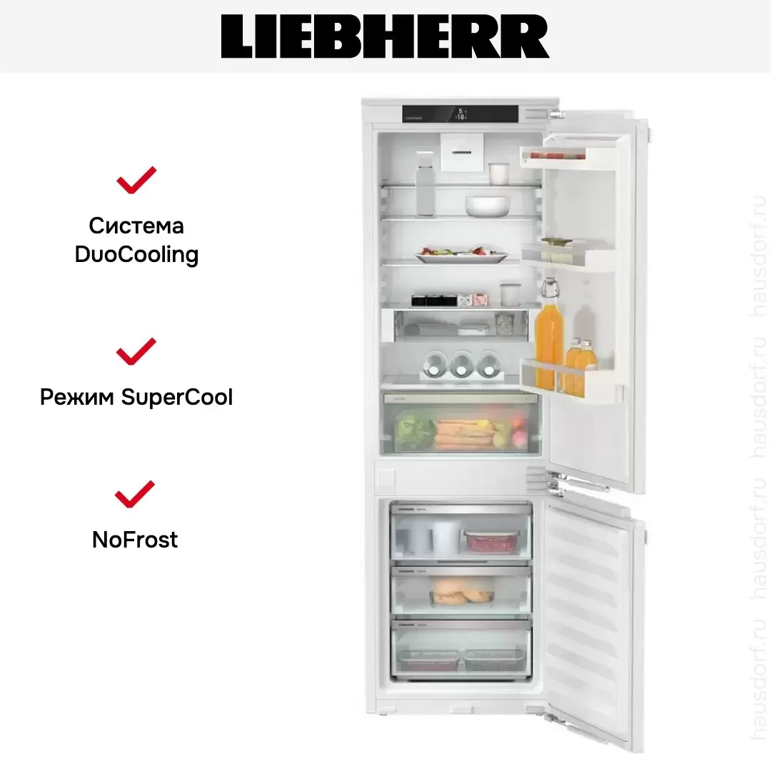 Холодильник Liebherr ICNe 5123 Plus NoFrost — встраиваемая модель. Для его установки необходима специальная ниша в мебельном гарнитуре. Устройство остается невидимым в интерьере, так как на его фасад навешивается декоративная панель. Прибор представляет собой традиционную комбинация — морозильное отделение снизу и холодильное сверху. Эргономичность внутреннего пространства обеспечивает удобное расположение продуктов и упаковок. Для этого предусмотрены ящики, полки, держатель для бутылок, а также балконы на двери. Электронное управление обеспечивает точность при внесении настроек. Холодильник Либхер ICNe 5123 не требует размораживания, что облегчает процесс обслуживания, экономит время и силы. Тихая работа — еще одно преимущество изделия. Уровень шума составляет всего 36 дБ, что является комфортным значением.