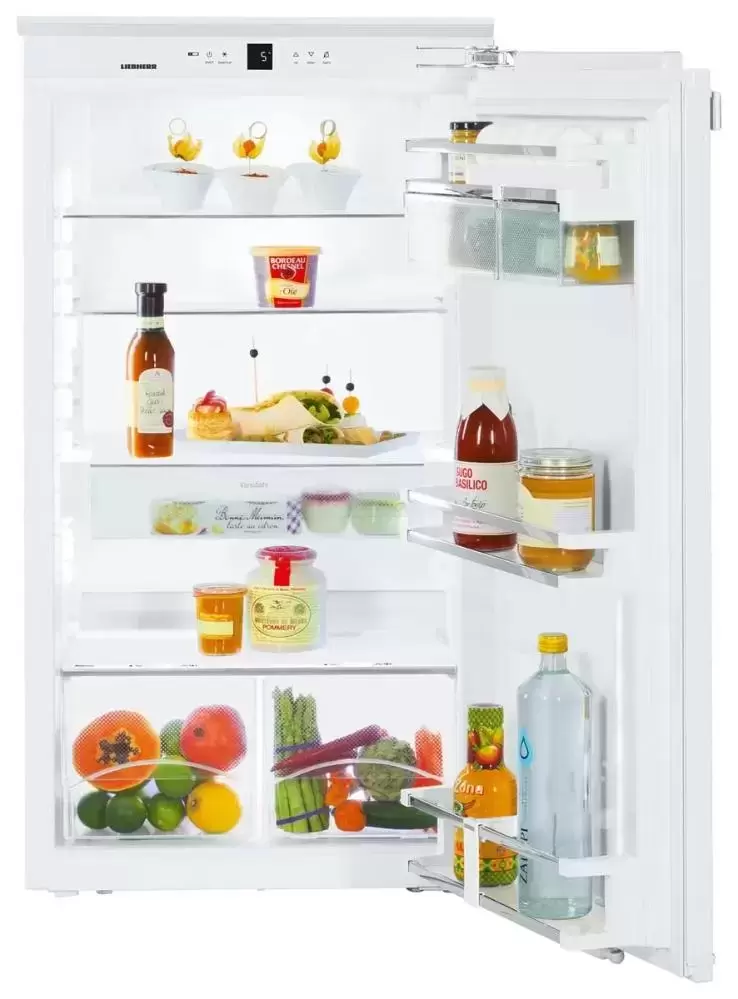 Небольшое устройство высотой 102 см и емкостью 192 литра с автоматической системой размораживания полностью интегрируется в интерьер и подойдет для установки дома, в офисе или в гостинице. Дверные петли находятся справа, но без труда перенавешиваются на левую сторону. Дверца открывается очень широко благодаря жесткой навеске мебельного фасада. Прибор оснащен электронным управлением: панель управления располагается в верхней части за дверцей и включает сенсорные кнопки и ЖК-дисплей MagicEye с цифровой индикацией температуры. Функции панели управления можно заблокировать от детей. Специальный индикатор и звуковой сигнал оповестит о неплотно закрытой дверце. Модель отличает уникально низкий уровень шума, равный всего 33 дБ. При повышении наружной температуры рекомендуется включать встроенный вентилятор, равномерно распределяющих охлажденный воздух по всему объему камеры. Режим суперохлаждения SuperСool позволит уменьшить температуру перед тем, как загрузить в холодильник большое количество продуктов. Полки Premium GlassLine изготовлены из ударопрочного стекла, их можно регулировать по высоте, а среднюю полку — складывать в двух положениях.