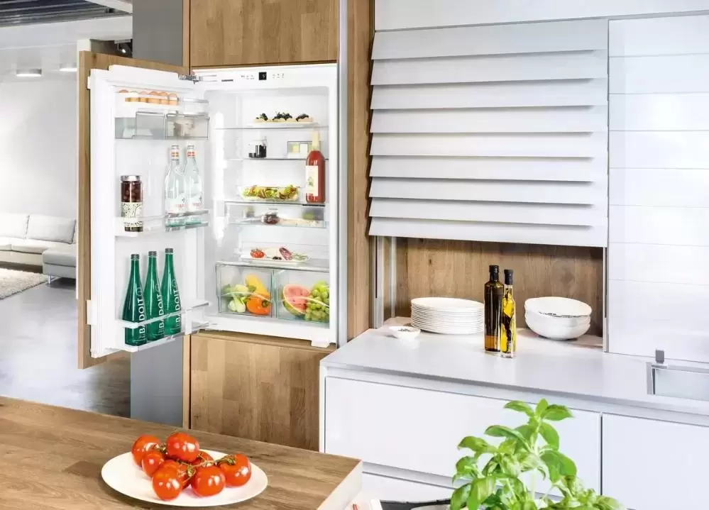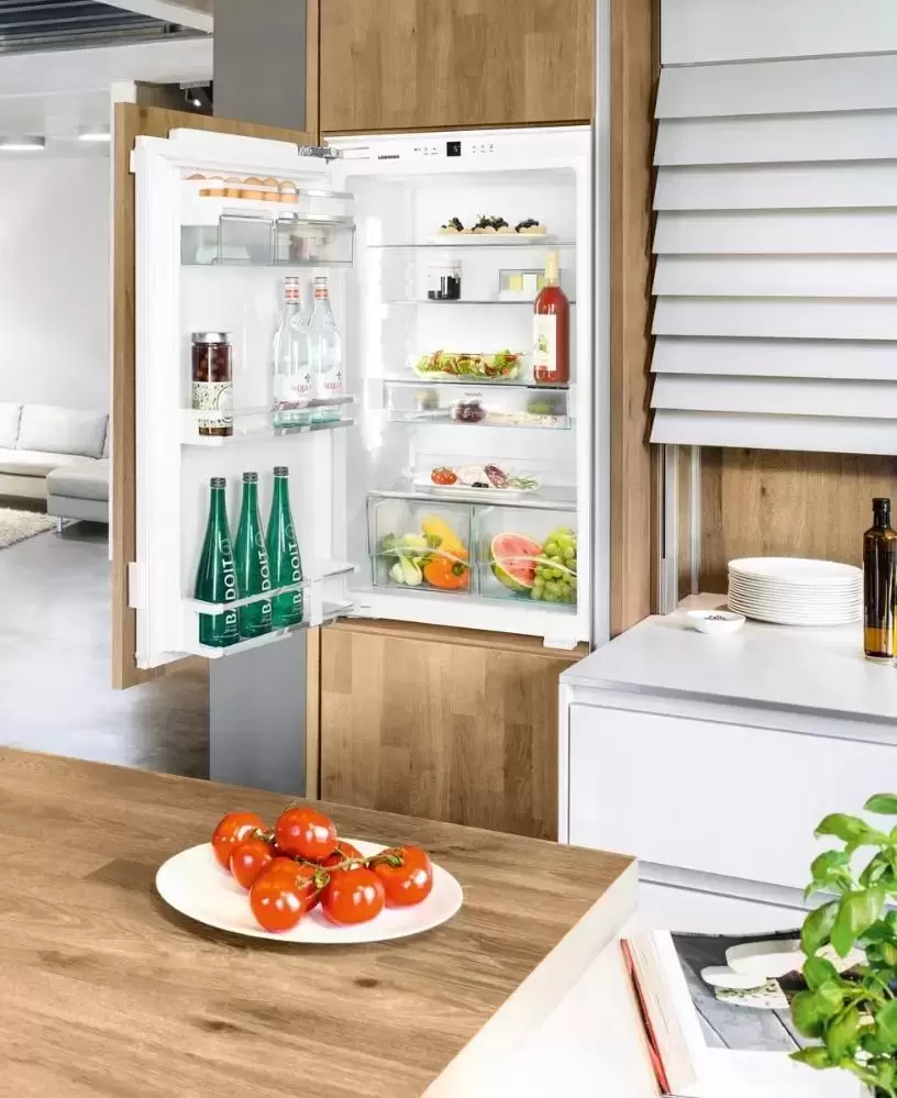 Встраиваемый холодильник Liebherr с отделением BioCool. Дверца модели закрывается плавно — доводчик обеспечивает удивительно мягкое закрывание двери даже при максимальном заполнении двери холодильника, если угол открытия составляет менее 30°, холодильная камера закроется автоматически.