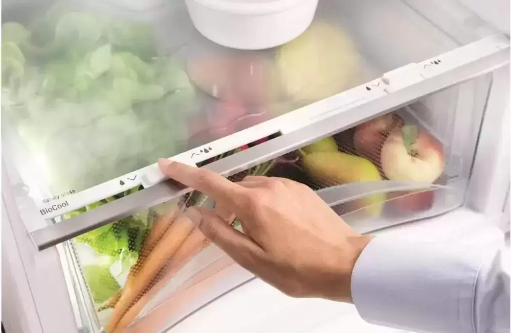 В холодильном отделении находятся регулируемые по высоте полки GlassLine из ударопрочного стекла с полосой из нержавеющей стали, отделение для бутылок, а также съемные контейнеры с крышкой VarioBox. В морозильной камере имеются выдвижные плотно закрывающиеся контейнеры FrostSafe со специальными роликами и прозрачным фронтом. Зона свежести BioCool позволяет регулировать уровень влажности для увеличения срока хранения овощей и фруктов.