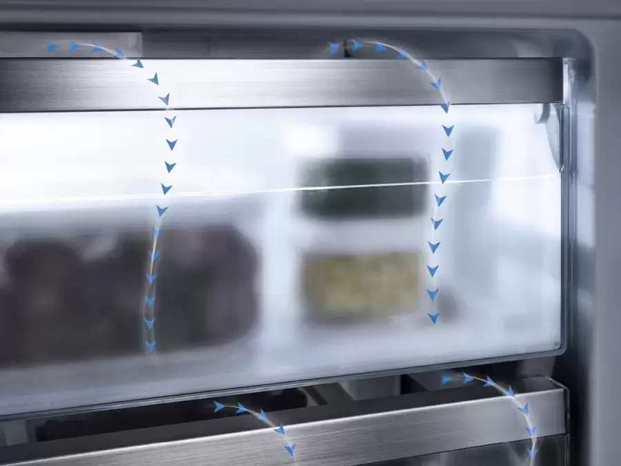 В холодильной камере предусмотрены три полки из безопасного стекла и отделение для бутылок, а также две полки на дверце. В зоне свежести расположены две полки/контейнеры. Все это позволяет эффективно использовать пространство и хранить продукты в оптимальных условиях. Система контроля влажности помогает сохранить свежесть продуктов на долгое время.