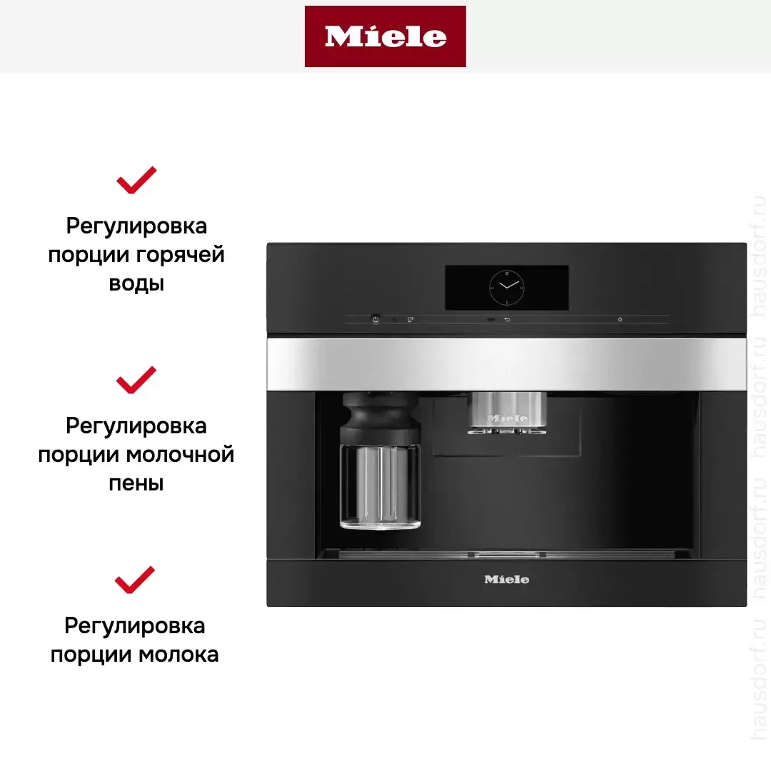 Модель высотой 45 см успешно встраивается в колонну с другой техникой — например, подогревателем для посуды. В верхней части расположена сенсорная панель управления M Touch с удобной возможностью перелистывания и прокрутки. Функция «Кофе в кофейник» служит для приготовления 8 чашек кофе сразу. Функция CupSensor поможет установить чашку ровно, чтобы не пролилось ни одной капли. Для молока предназначается стеклянная емкость размером 700 мл с системой EasyClick. Предусмотрена эффектная подсветка чашек BrilliantLight. Имеется возможность стационарного подключения к водопроводу.