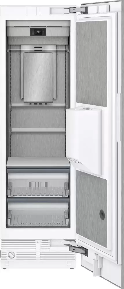 Морозильник Gaggenau встраивается в мебель, открывается с помощью ручки или автоматически. На двери расположен ледогенератор с постоянной подачей воды, режимы работы: лед, крошка и охлажденная вода. В камере установлены полки из закаленного стекла, две из них можно переставить по высоте. Цвет — нержавеющая сталь и темный антрацит.