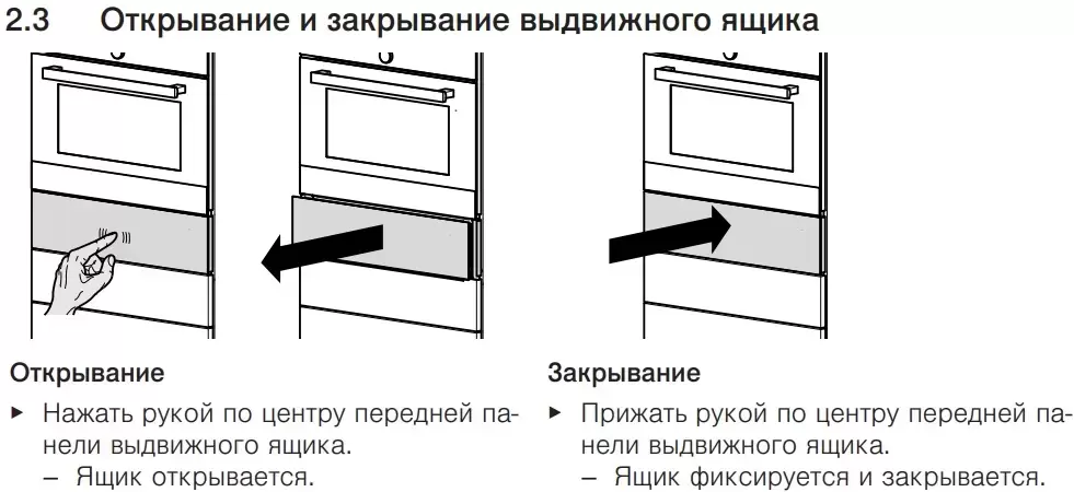 Дверца открывается нажатием на специальную область фронтальной панели — таким образом модель Фауцуг отлично вписывается даже в современный бесшовный дизайн интерьера. Основной материал внутренней поверхности — нержавеющая сталь.