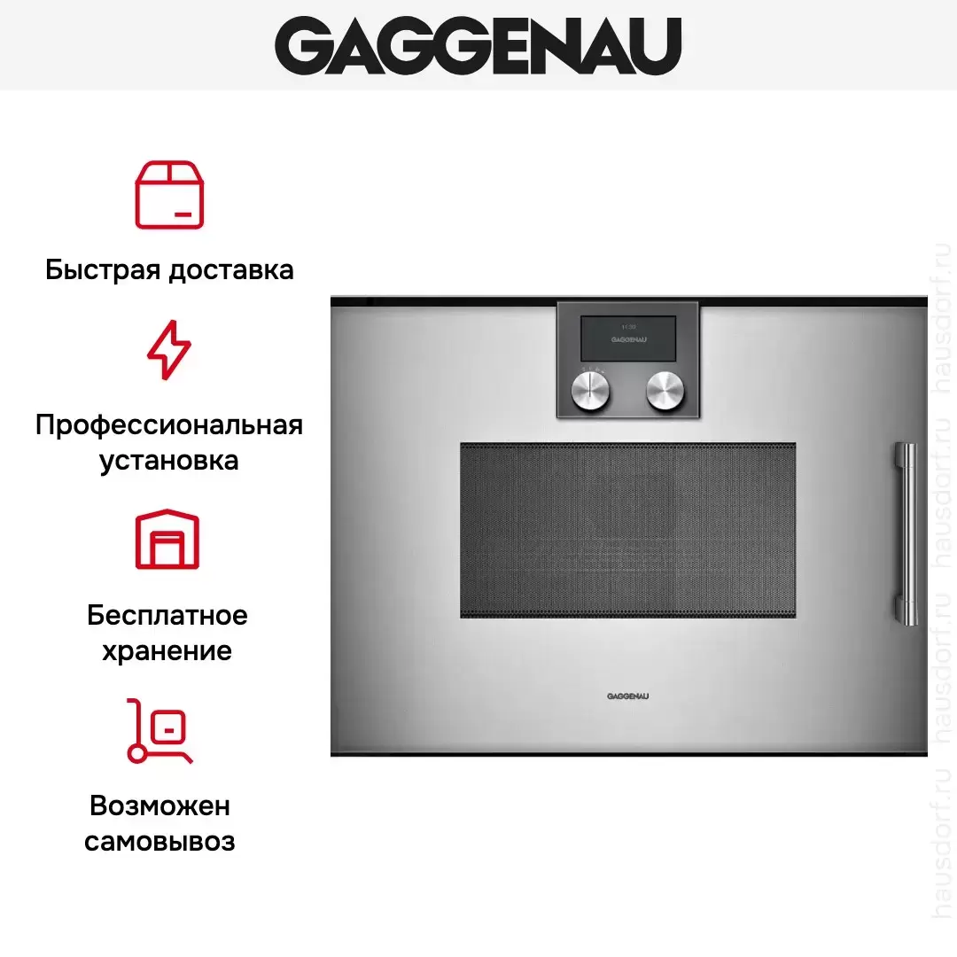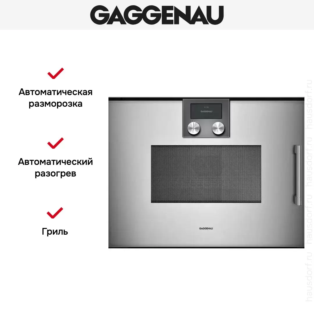 Количество режимов в данной модели Гаггенау: 4 шт. Для обработки продуктов и готовых блюд используются следующие виды нагрева: Микроволны, Гриль, Гриль + конвекция (обдув), Микроволны + гриль, Микроволны + конвекция (обдув). Выберите гриль, чтобы получить поджаристую корочку на мясе или рыбе. Тип гриля в этой микроволновке кварцевый. Конвекция способствует равномерную распространению горячего воздуха по всей камере, поэтому даже если блюдо большое, все его кусочки пропекаются одинаково. Если вы спешите, а еду нужно разогреть, используйте быстрый старт — благодаря ему 30 секунд прибор работает на полной мощности. Автоматические программы для приготовления добавлены производителем также для упрощения работы.