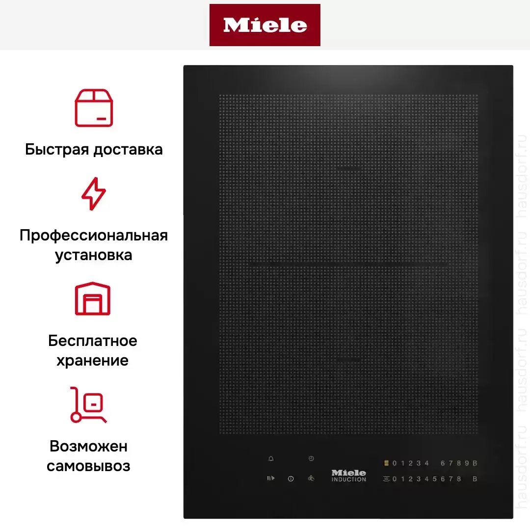 Элемент панели SmartLine Miele с индукционной зоной приготовления PowerFlex. Управление с помощью цифровой клавиатуры Smart Select позволяет легко настраивать мощность и время работы конфорки. Модель может устанавливаться как заподлицо, так и накладным способом.