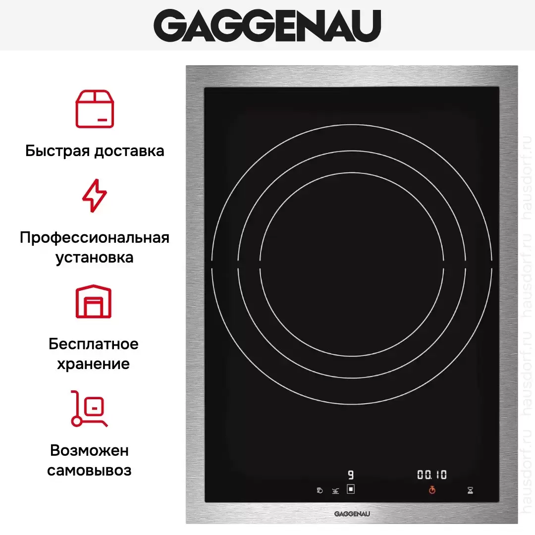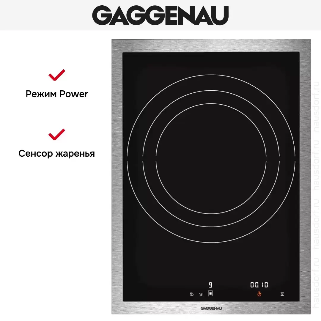Gaggenau VI 414-111 — индукционная варочная панель в рамке из нержавеющей стали. Модель подходит для установки внакладку или заподлицо со столешницей и прекрасно сочетается с другими приборами серии Vario 400. Сенсор жарения, бустер и таймер расширяют функционал устройства.