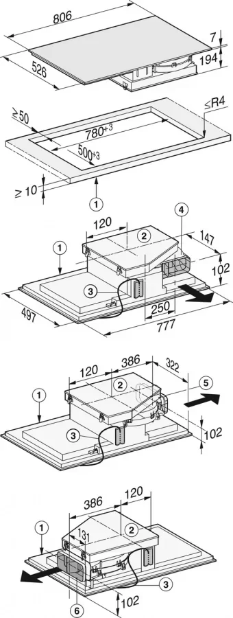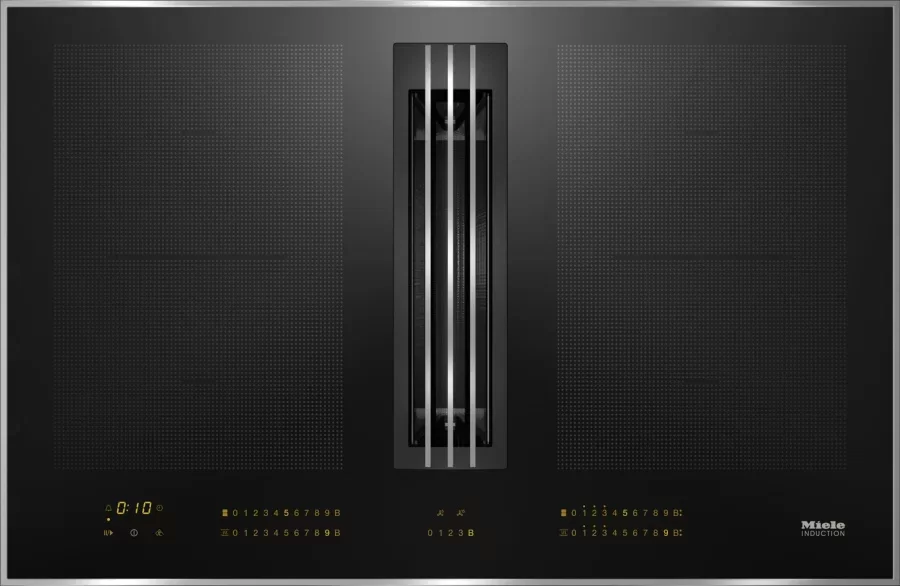 Miele KMDA7633 FR — индукционная варочная панель со встроенной вытяжкой, которая может работать в режиме отвода воздуха и циркуляции. Оснащена жироулавливающим фильтром из нержавеющей стали, пригодным для мытья в посудомоечной машине. Имеет 4 конфорки с функцией автоматического распознавания наличия и размеров посуды.