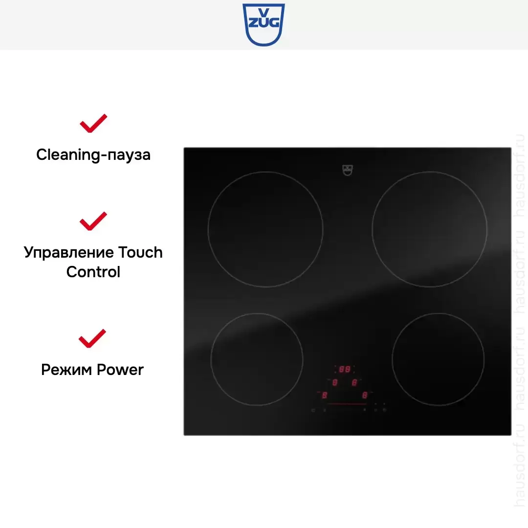 Варочная панель работает на индукционном нагреве — это значит, что повышается температура непосредственно посуды, в которой готовится блюдо. Таким образом промежуточная ступень с предварительным нагревом конфорки пропускается — сокращается время, повышается безопасность. Количество конфорок в этой модели: 4.