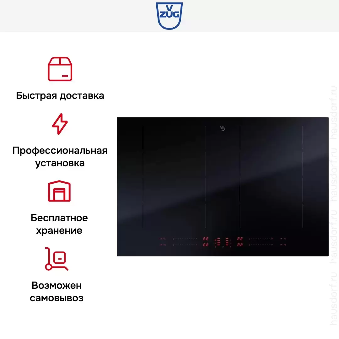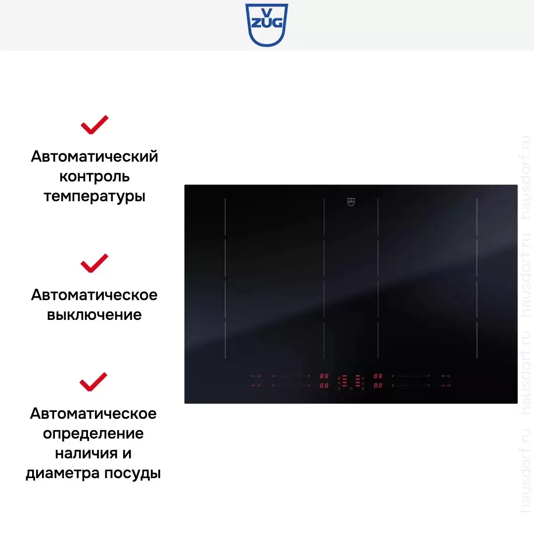 Варочная панель работает на индукционном нагреве — это значит, что повышается температура непосредственно посуды, в которой готовится блюдо. Таким образом промежуточная ступень с предварительным нагревом конфорки пропускается — сокращается время, повышается безопасность. Количество конфорок в этой модели: 4.