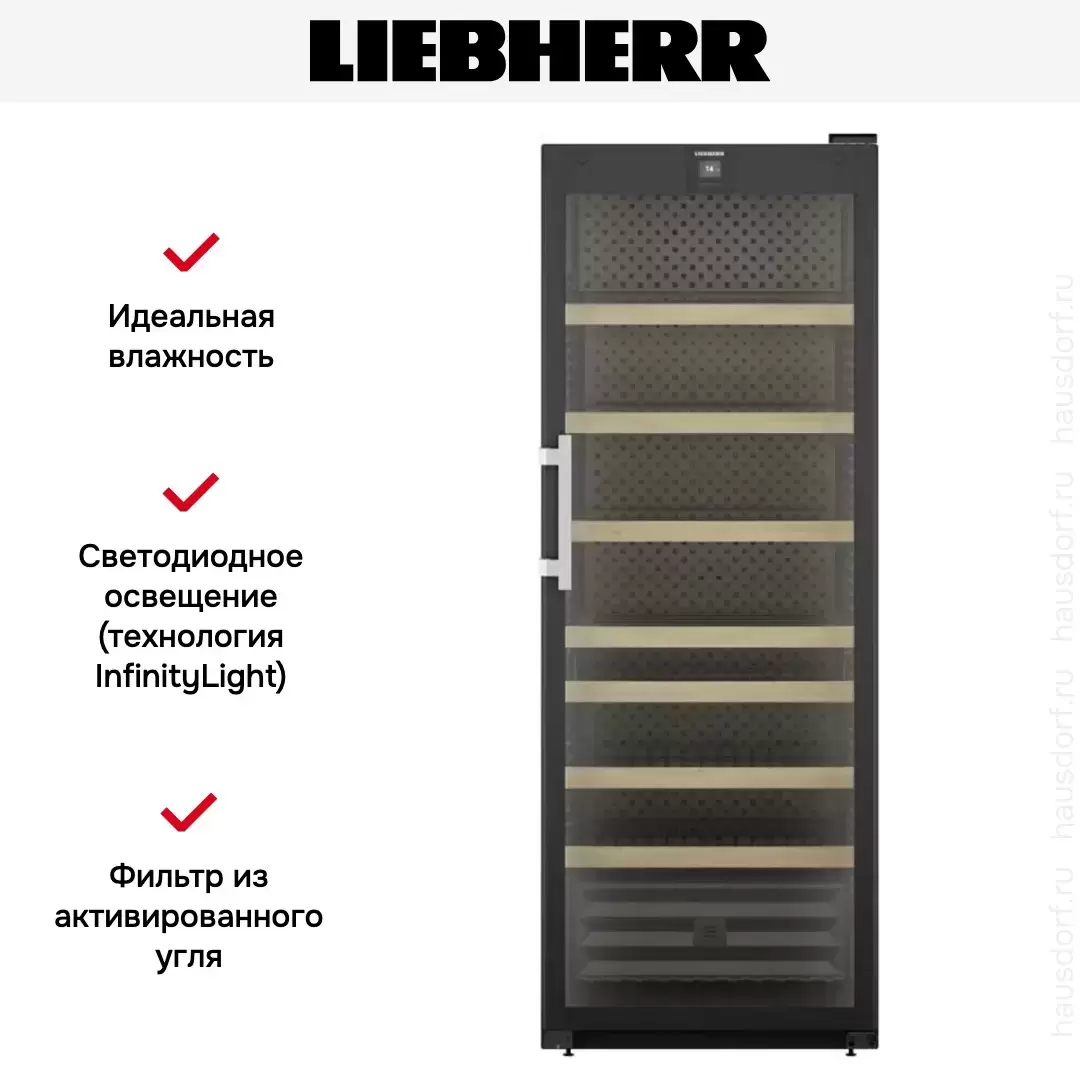 Винный холодильник Liebherr WFbli 7741 имеет одну температурную зону, в которой можно разместить бутылки и единовременно выставить только одну комбинацию настроек. Он устанавливается отдельно, что удобно, если у вас есть специальное помещение — кладовая, погреб и т.д. Количество бутылок, которое можно разместить с учетом полной комплектации и из расчета объема бутылки 0,75 л, — 284 шт.