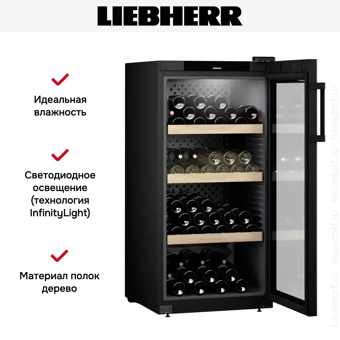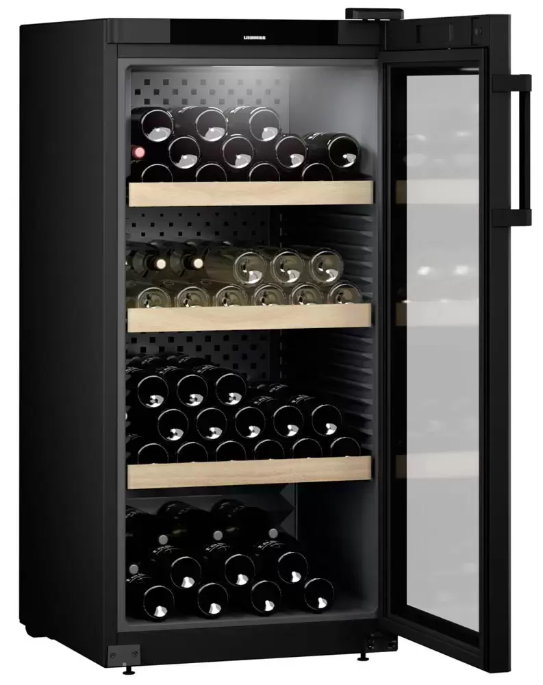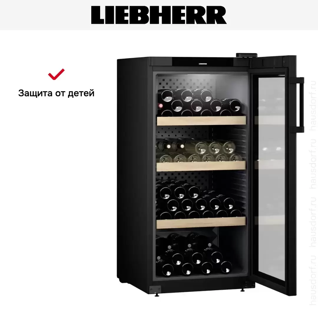 Винный холодильник Liebherr WPbl 4201 имеет одну температурную зону, в которой можно разместить бутылки и единовременно выставить только одну комбинацию настроек. Он устанавливается отдельно, что удобно, если у вас есть специальное помещение — кладовая, погреб и т.д. Количество бутылок, которое можно разместить с учетом полной комплектации и из расчета объема бутылки 0,75 л, — 141 шт.