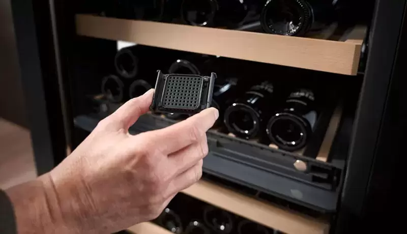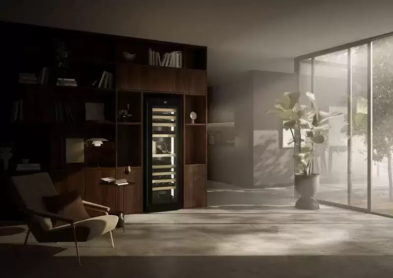 Стеклянная дверь — дополнительный изящный штрих к общему дизайну модели. Специальное покрытие защищает вино от влияния ультрафиолетовых лучей, которые проникают, если шкаф находится в солнечной комнате. Цвет корпуса — черный. Дверь можно перевесить на другую сторону, поэтому вариантов размещения его в доме становится больше. Доводчик делает открытие и закрытие плавным.