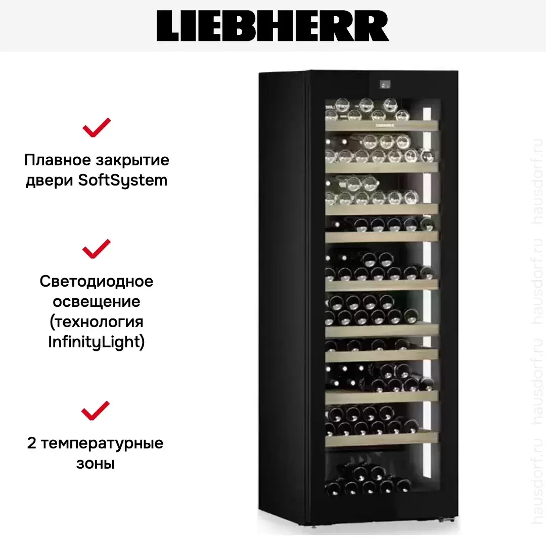 Винный холодильник Liebherr WPgbi 7472 имеет две температурные зоны, в которых одновременно можно хранить разные сорта алкоголя и выставлять разные сочетания настроек. Он устанавливается отдельно, что удобно, если у вас есть специальное помещение — кладовая, погреб и т.д. Количество бутылок, которое можно разместить с учетом полной комплектации и из расчета объема бутылки 0,75 л, — 204 шт.